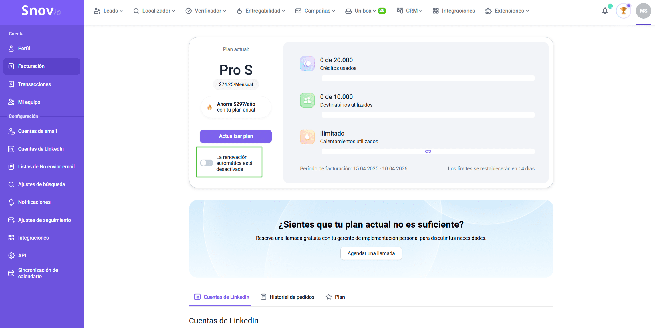 Ve a la sección de Facturación en la configuración de tu cuenta y asegúrate de que la renovación automática esté activada. Esto extenderá tu plan al final del período de facturación y transferirá automáticamente todos los créditos no utilizados del mes anterior.