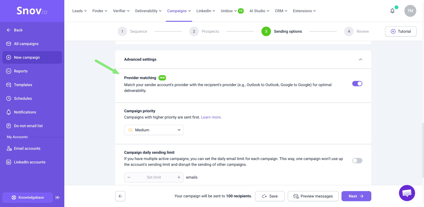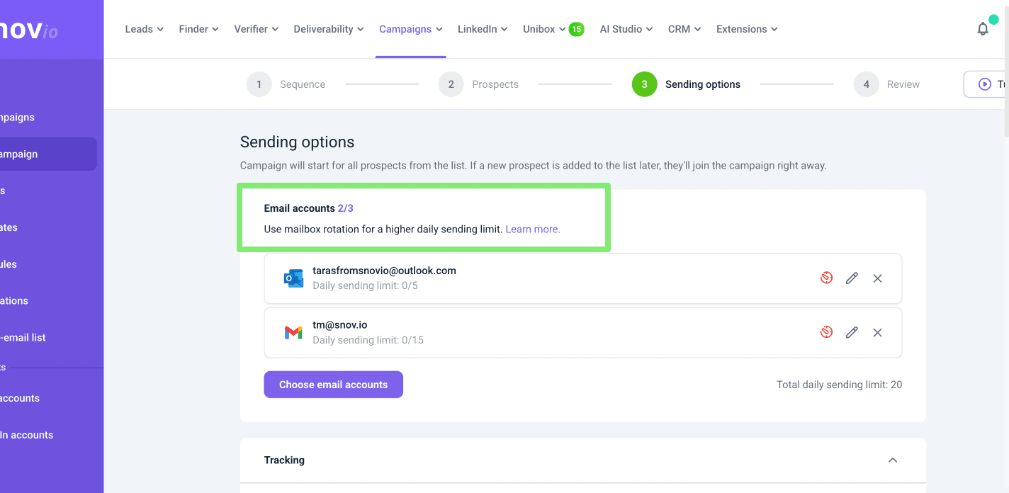 La Coincidencia de proveedores funciona solo en campañas con pasos de Correo electrónico en las que hayas añadido al menos dos cuentas de envío de diferentes proveedores. Esto le da a Snov.io opciones para elegir al enviar a distintos proveedores de destinatarios.