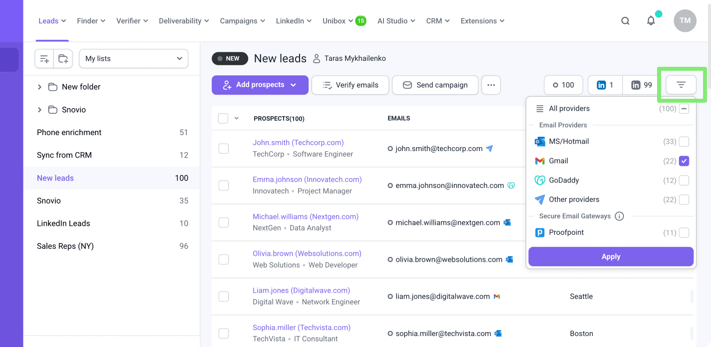 Usa el filtro en la esquina superior derecha para ver los prospectos por proveedor, de modo que puedas ver rápidamente cuántos están en Gmail, MS Outlook y otros proveedores.