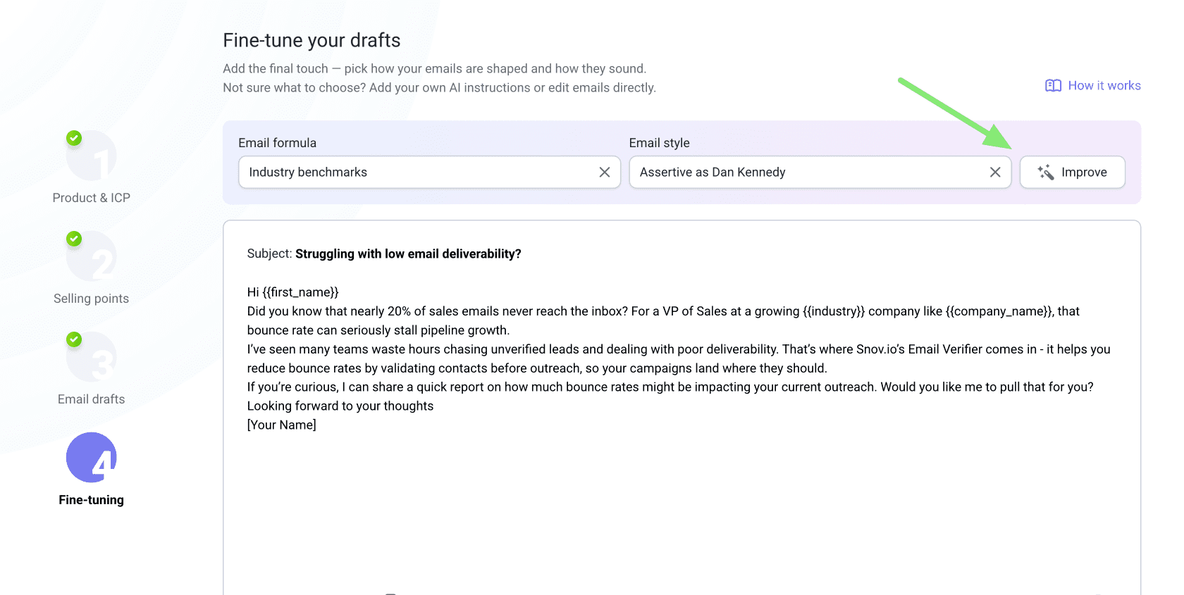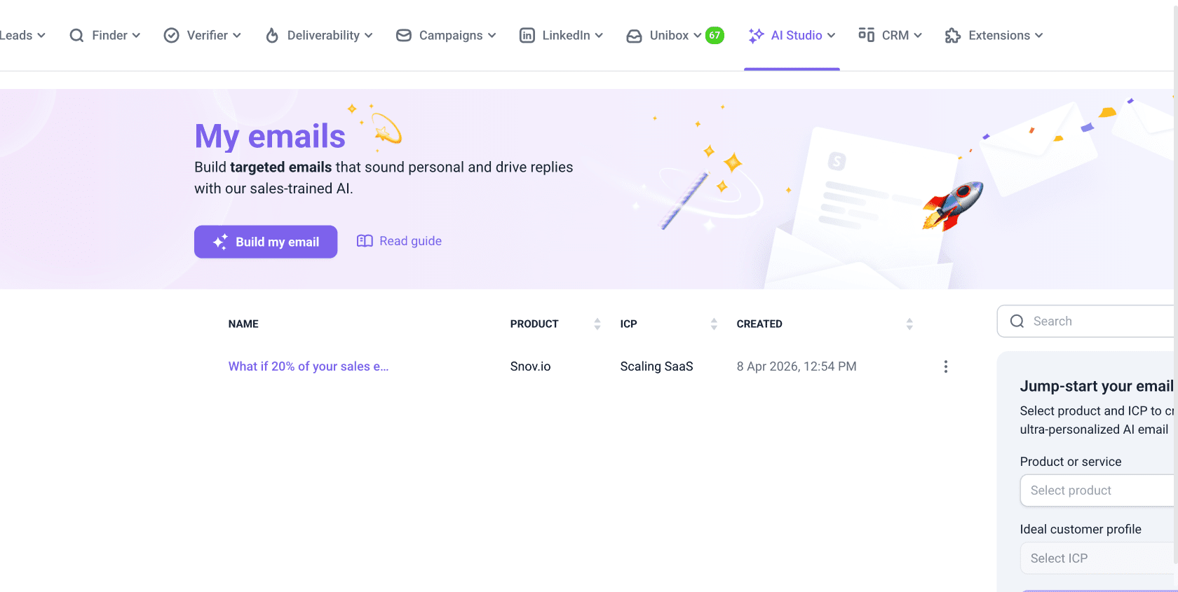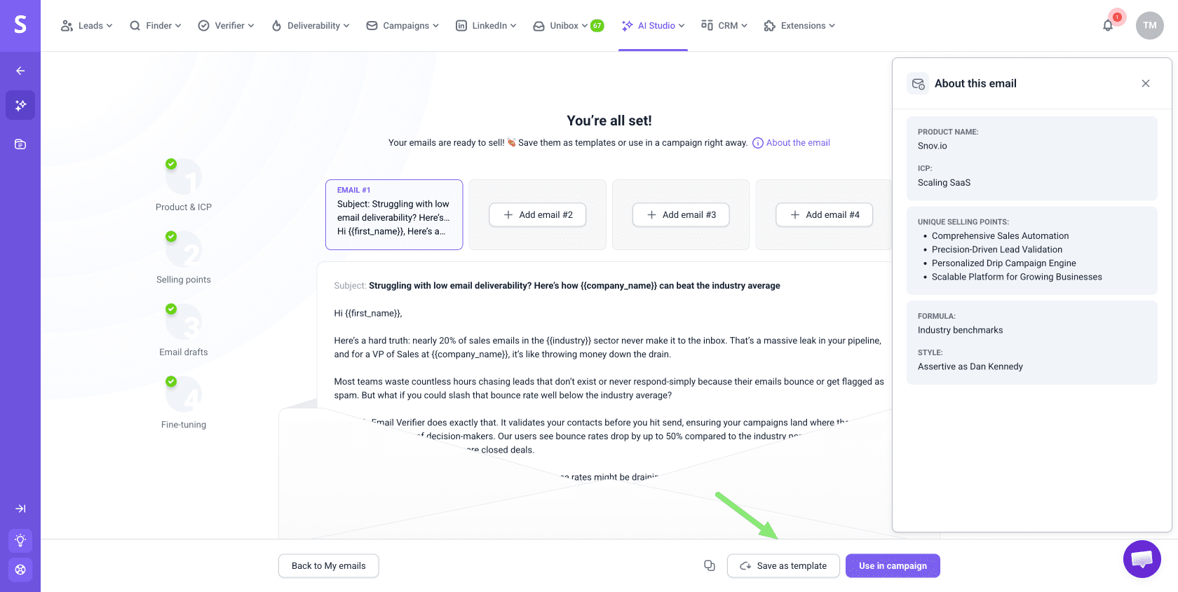Esta guía te enseñará a usar IA Studio de Snov.io para crear correos electrónicos que transmitan claramente tu valor a contactos específicos.