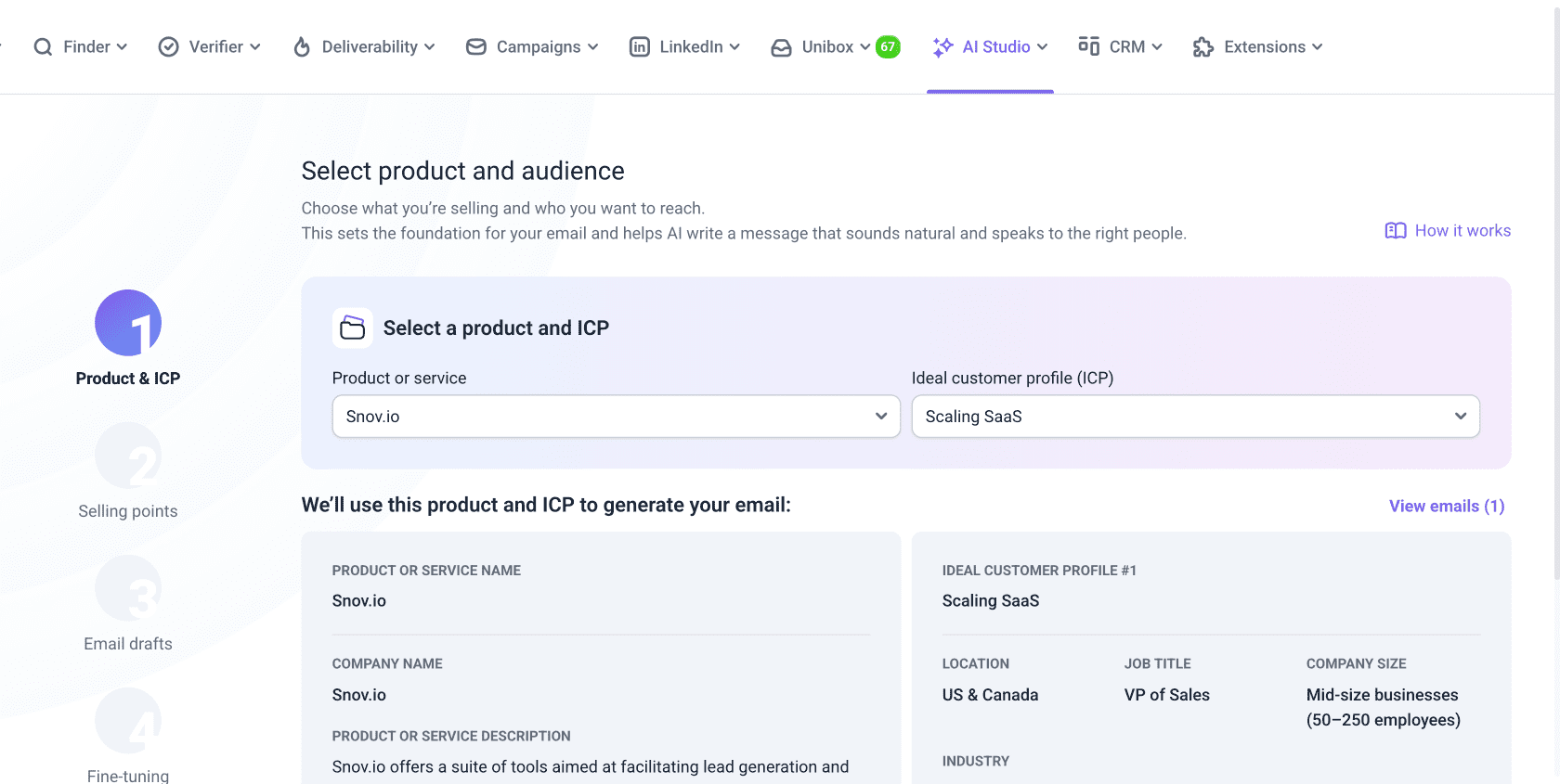 IA Studio te ayuda a crear correos electrónicos personalizados basados en los detalles de tu producto, puntos de valor y clientes objetivo. Hay cinco pasos simples para llegar a los borradores finales de los correos: