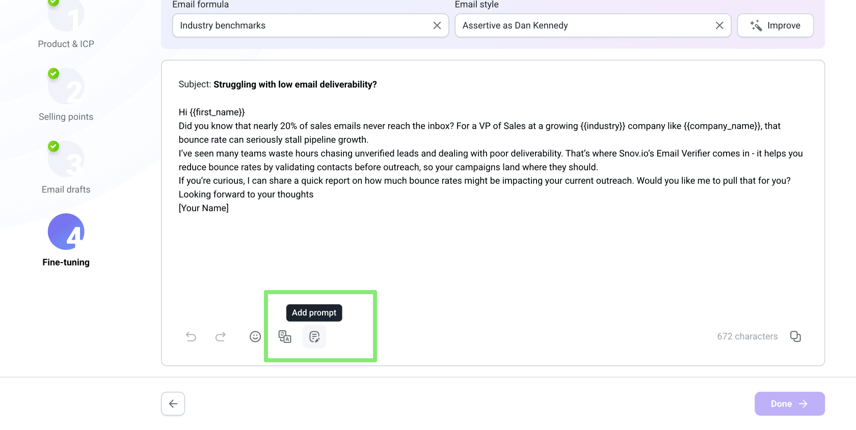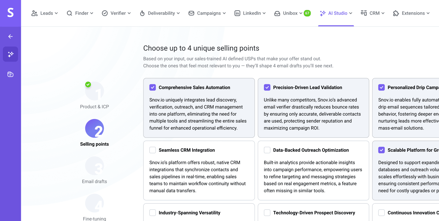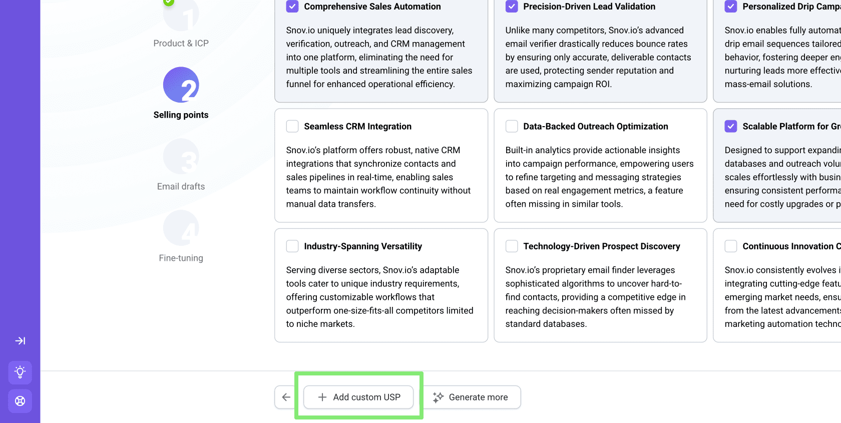 La IA sugerirá 9 puntos de venta basados en los detalles de tu producto y el perfil ICP. Estos puntos ayudan a que tu correo exprese claramente tu valor. Elige aquellos en los que deseas enfocarte en tu correo.