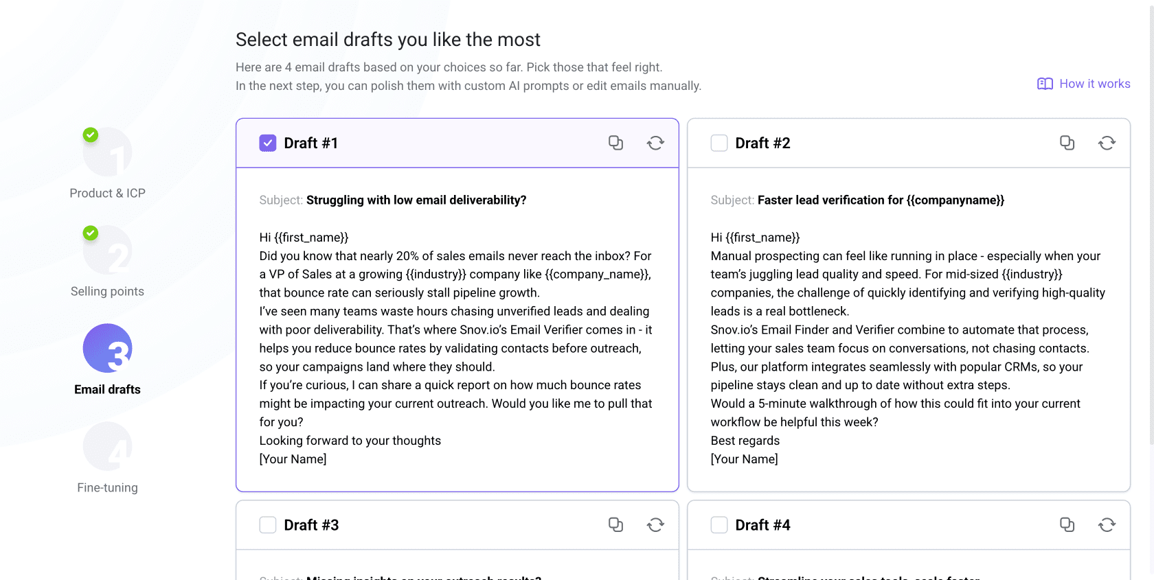 El siguiente paso muestra cuatro variantes de correo basadas en tus entradas anteriores. Elige el borrador que más te guste o selecciona los cuatro. Luego, afinarás tu elección con indicaciones personalizadas para la IA.