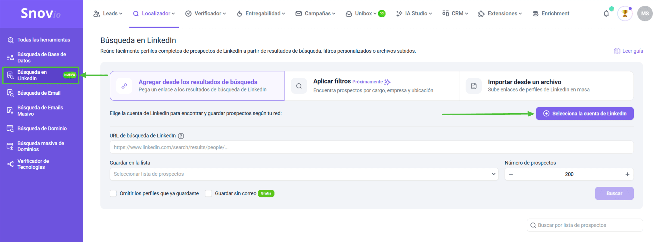 La Búsqueda de LinkedIn complementa las herramientas anteriores al ofrecer opciones avanzadas para encontrar leads directamente desde tu cuenta de Snov.io. Permite dos formas diferentes de búsqueda: