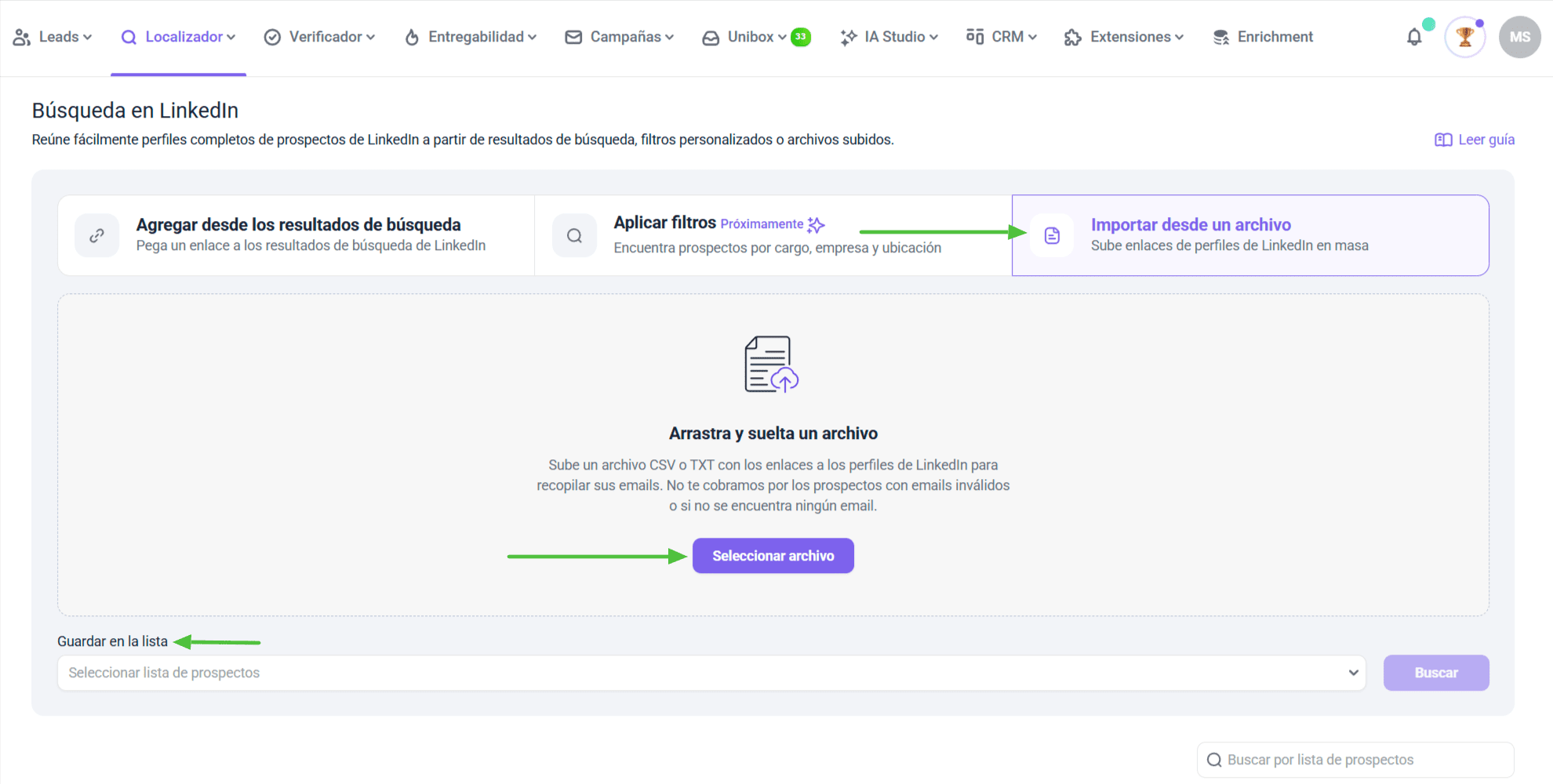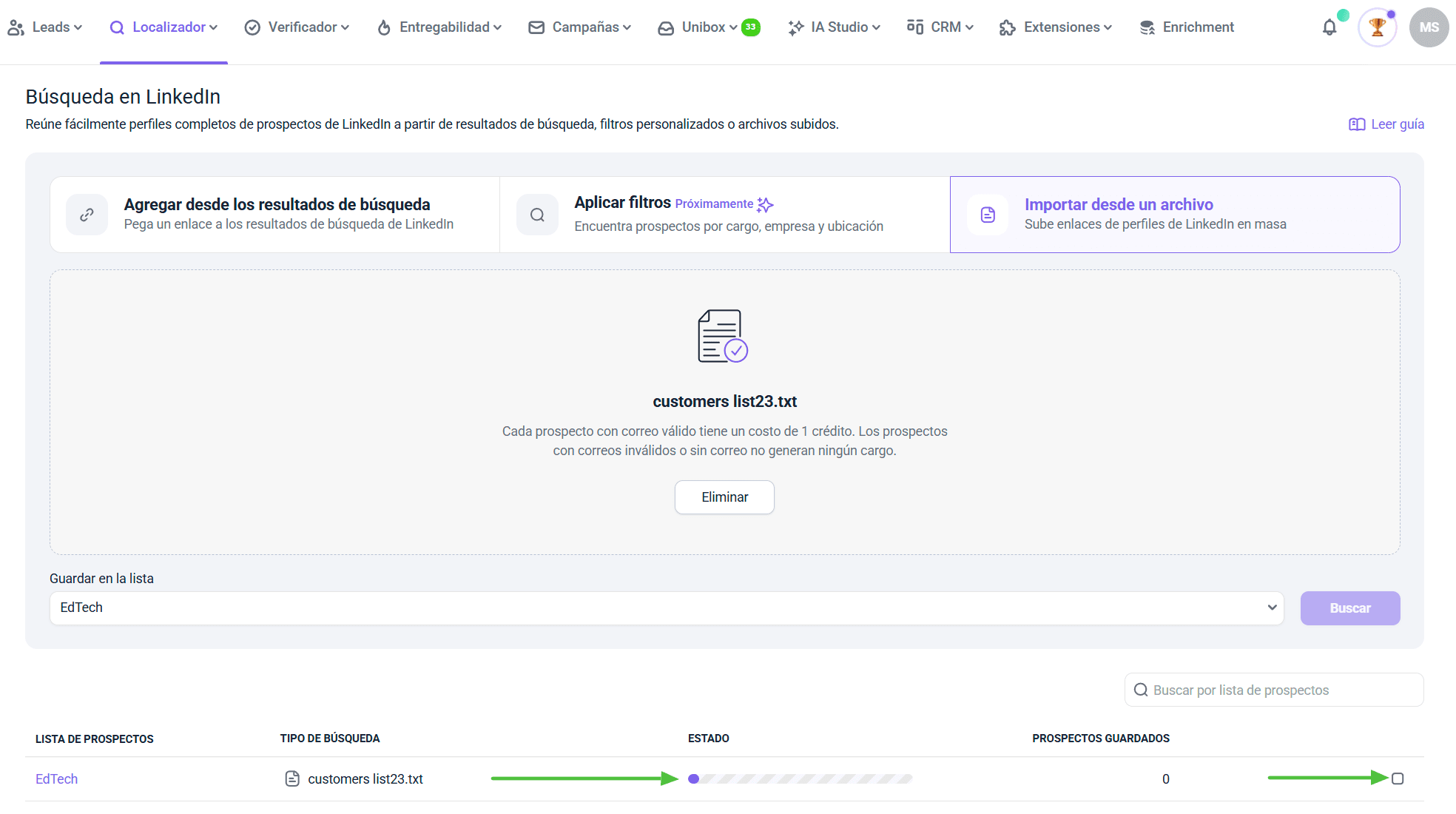 Una vez que subas el archivo de prospectos, nuestro sistema contará automáticamente el número de enlaces en él. No se te cobrará por prospectos con correos no válidos o no encontrados.