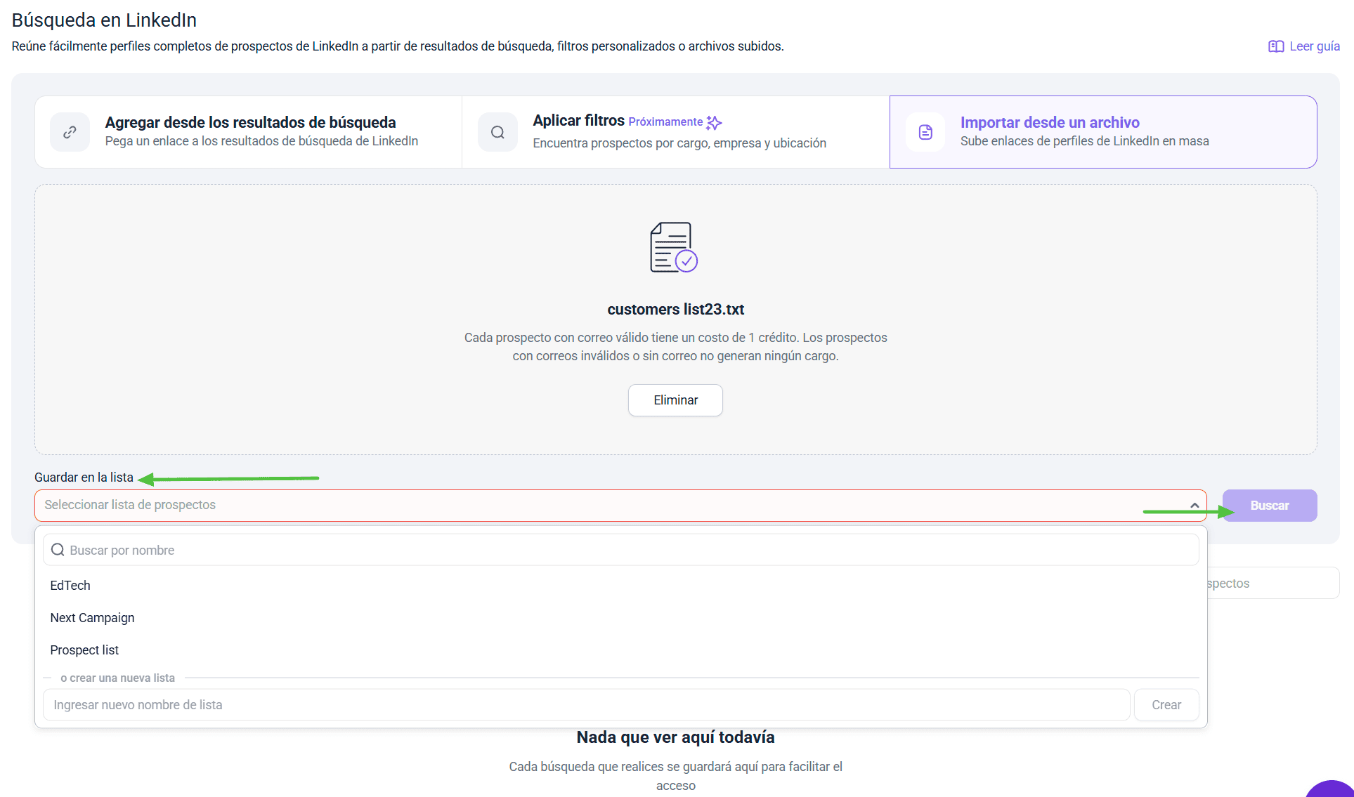 Selecciona una lista de prospectos donde se guardarán los resultados.