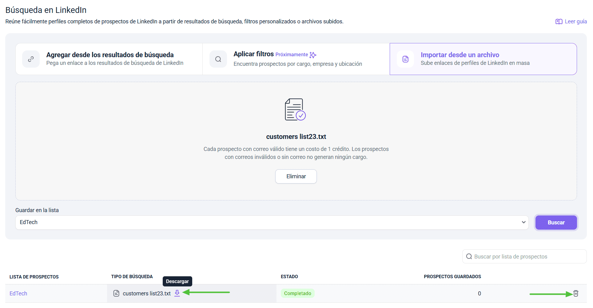 Revisa la lista de prospectos creada después de la búsqueda exitosa. Ahora puedes guardar o compartir los datos en un formato conveniente. Haz clic en el enlace de descarga para guardar la lista de prospectos. También tienes la opción de eliminar la lista de prospectos.