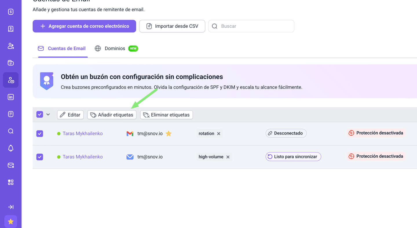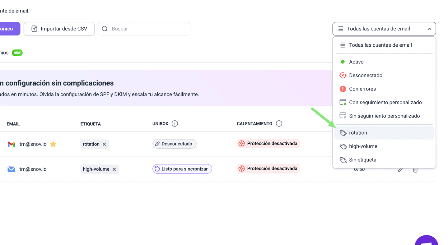 Usa etiquetas para segmentar y filtrar según propósito, propietario, estado de calentamiento, límite diario u otros criterios que tu equipo necesite. Las etiquetas se comparten en toda tu cuenta de equipo.