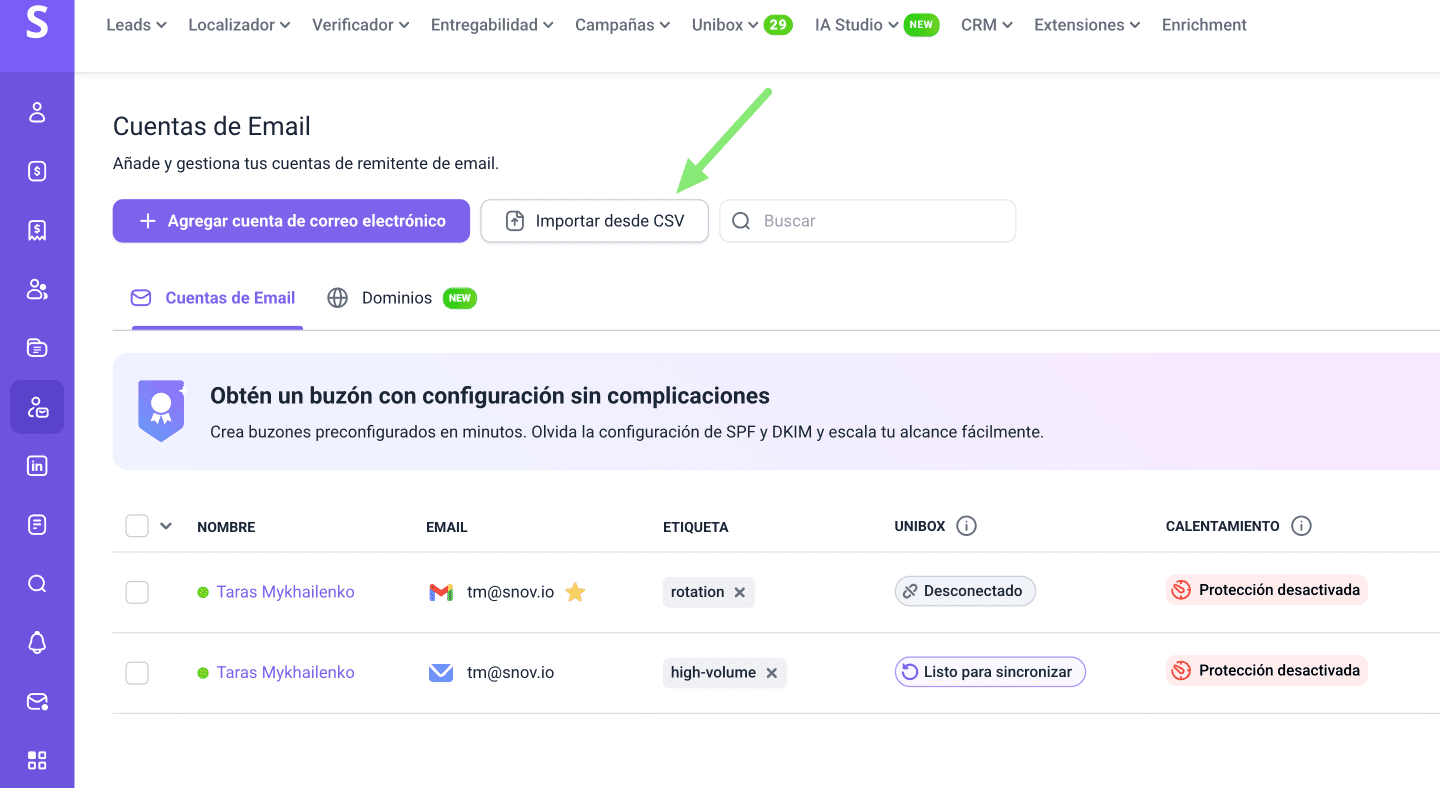 Sube un archivo CSV con los detalles de las cuentas y la configuración del proveedor, y Snov.io configurará automáticamente las cuentas utilizando los datos de tu archivo.