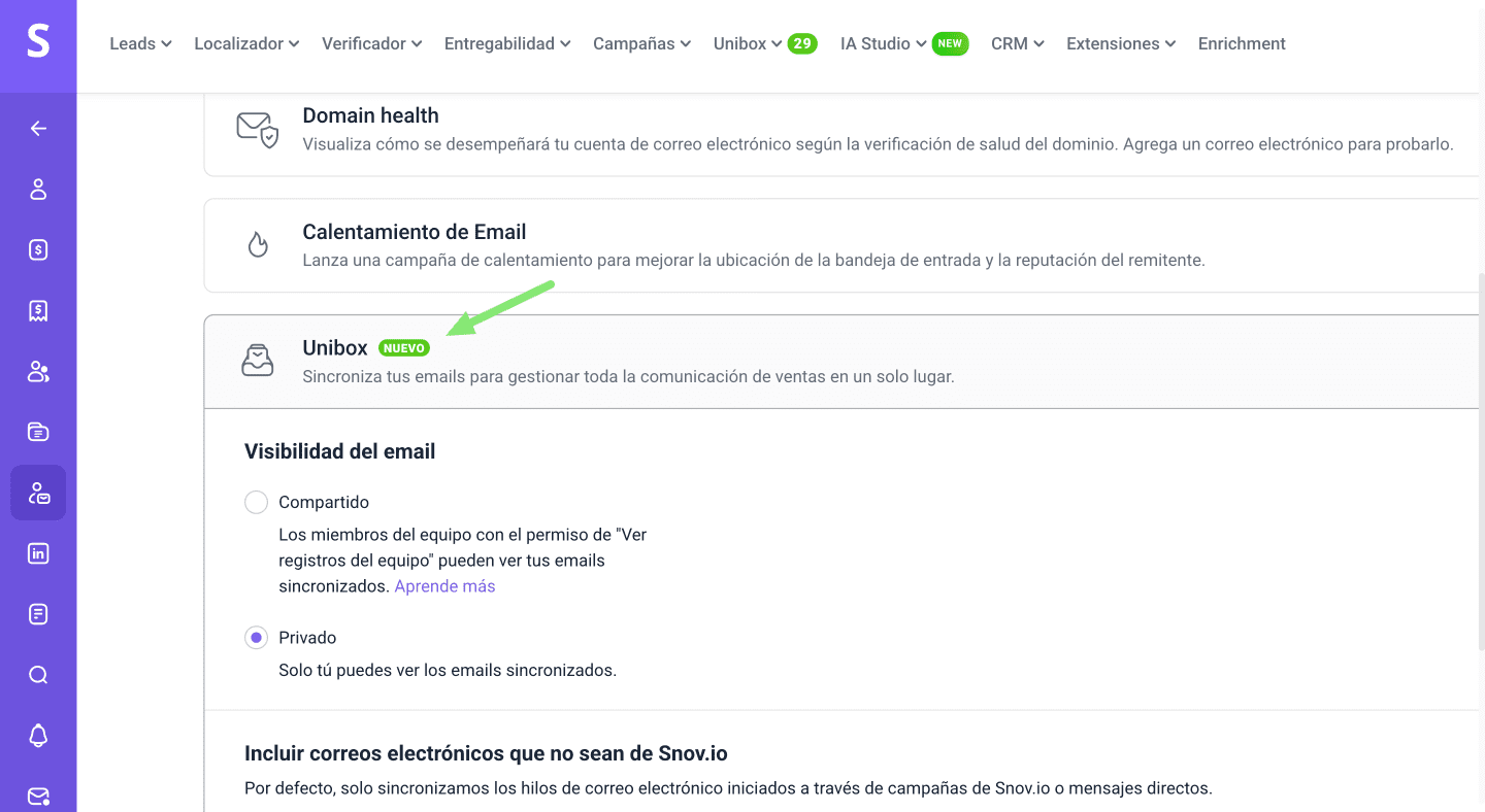 Una vez que hayas agregado tus cuentas, puedes conectarlas al buzón integrado de Snov.io y sincronizar todas tus actividades de correo electrónico.