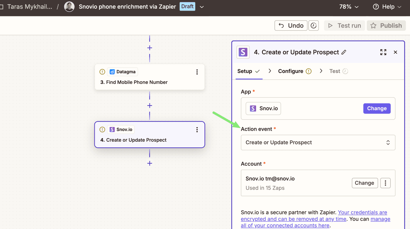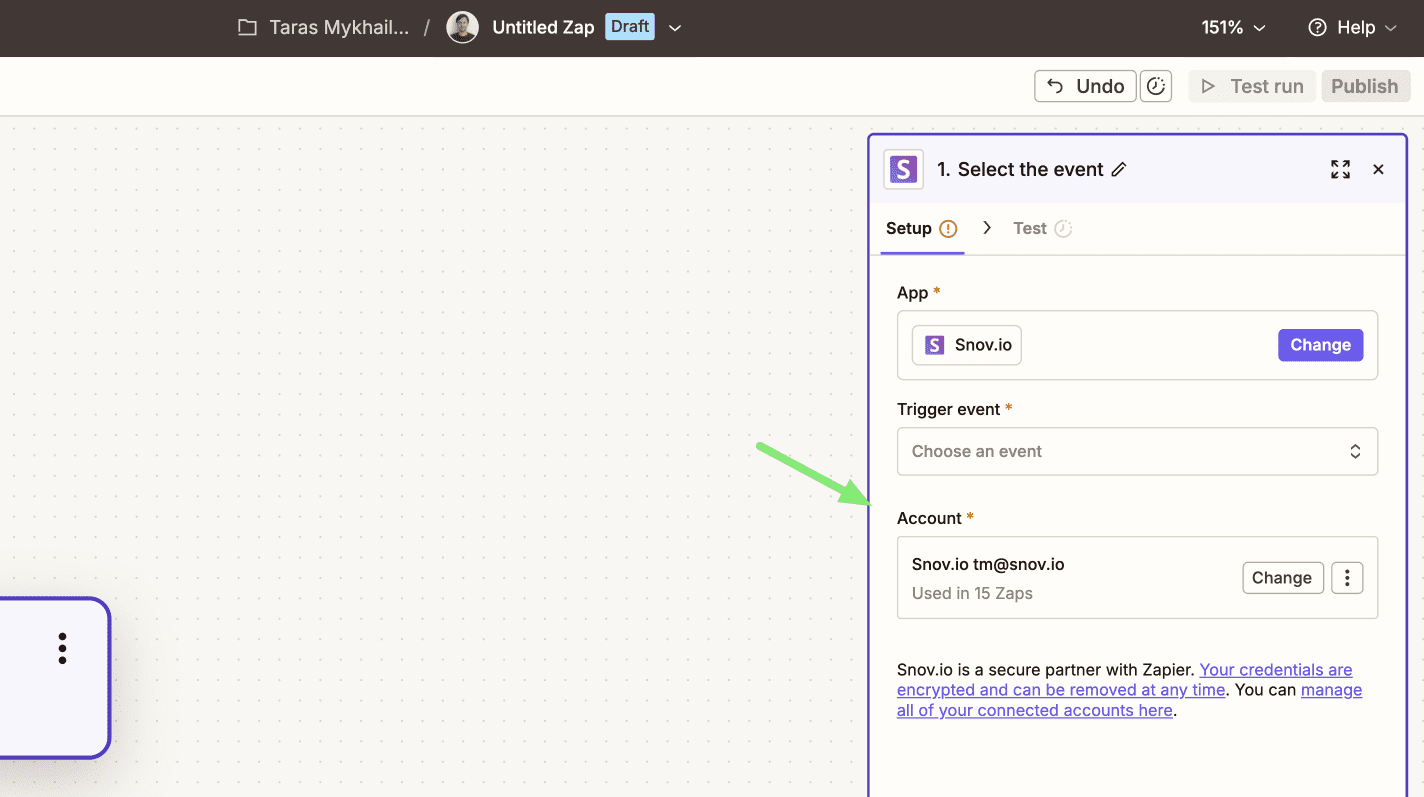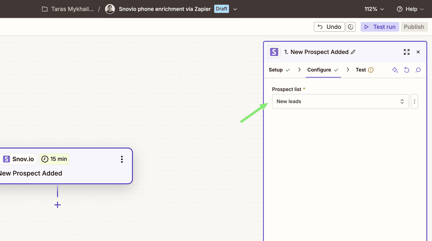 Create the trigger event (new prospect in Snovio)