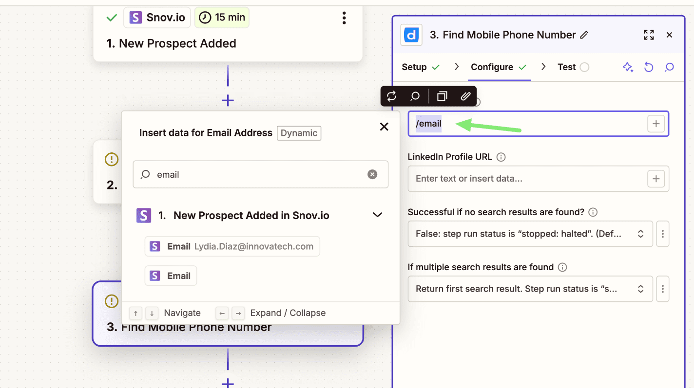 - Email: Map the prospect’s email field from a Snovio prospect.