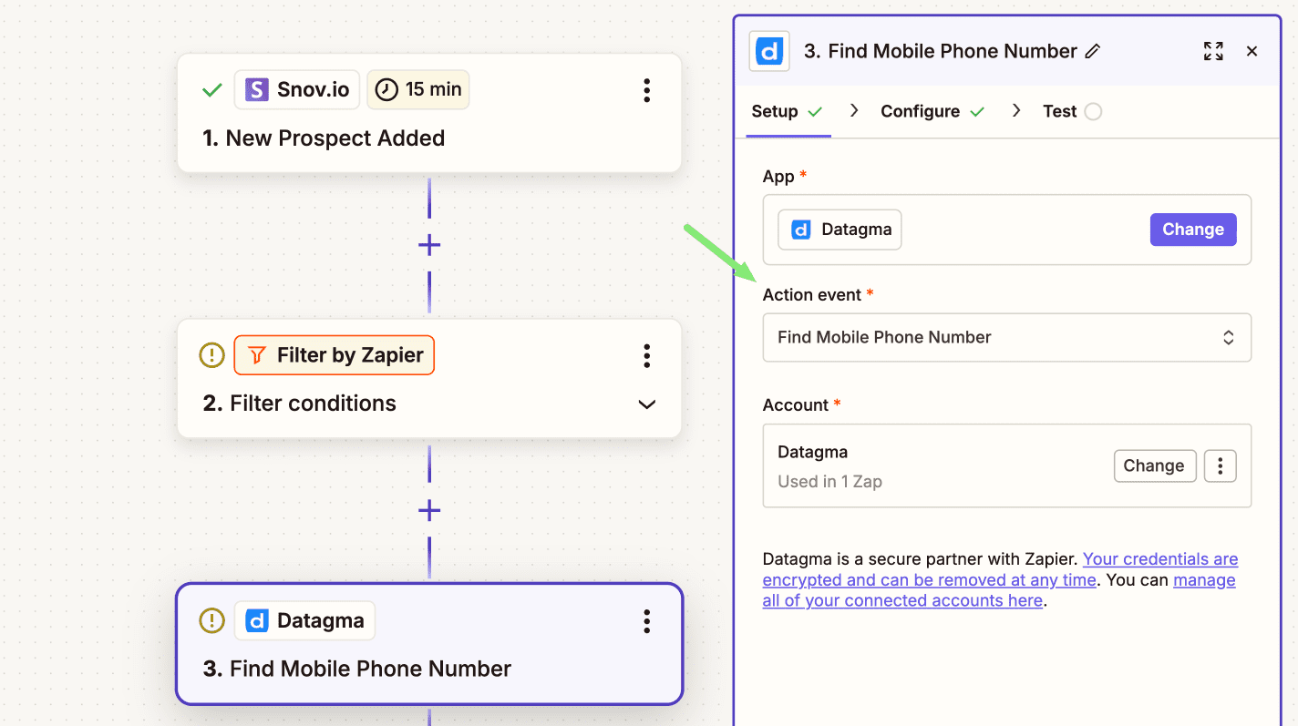 Select the data enrichment provider you’ll use for phone enrichment. We tested this workflow with Datagma.