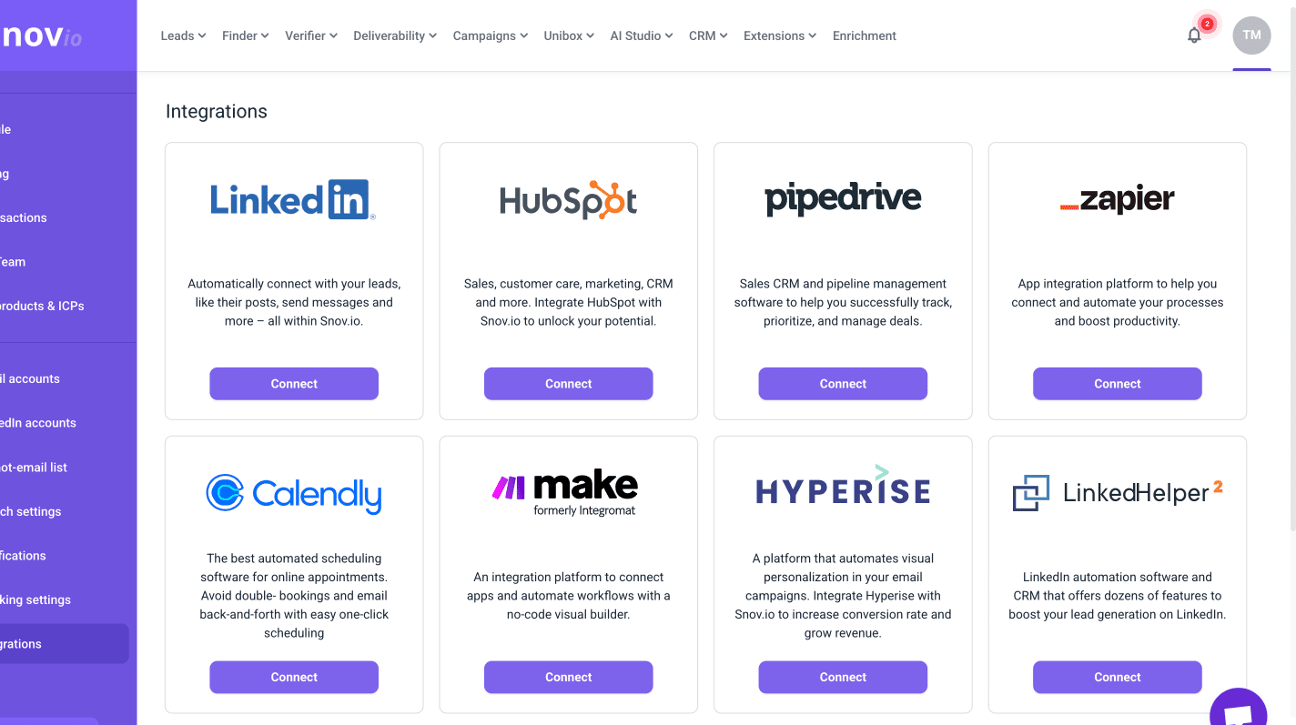 In Snov.io, go to your Account settings → Integrations, click Connect under Zapier.