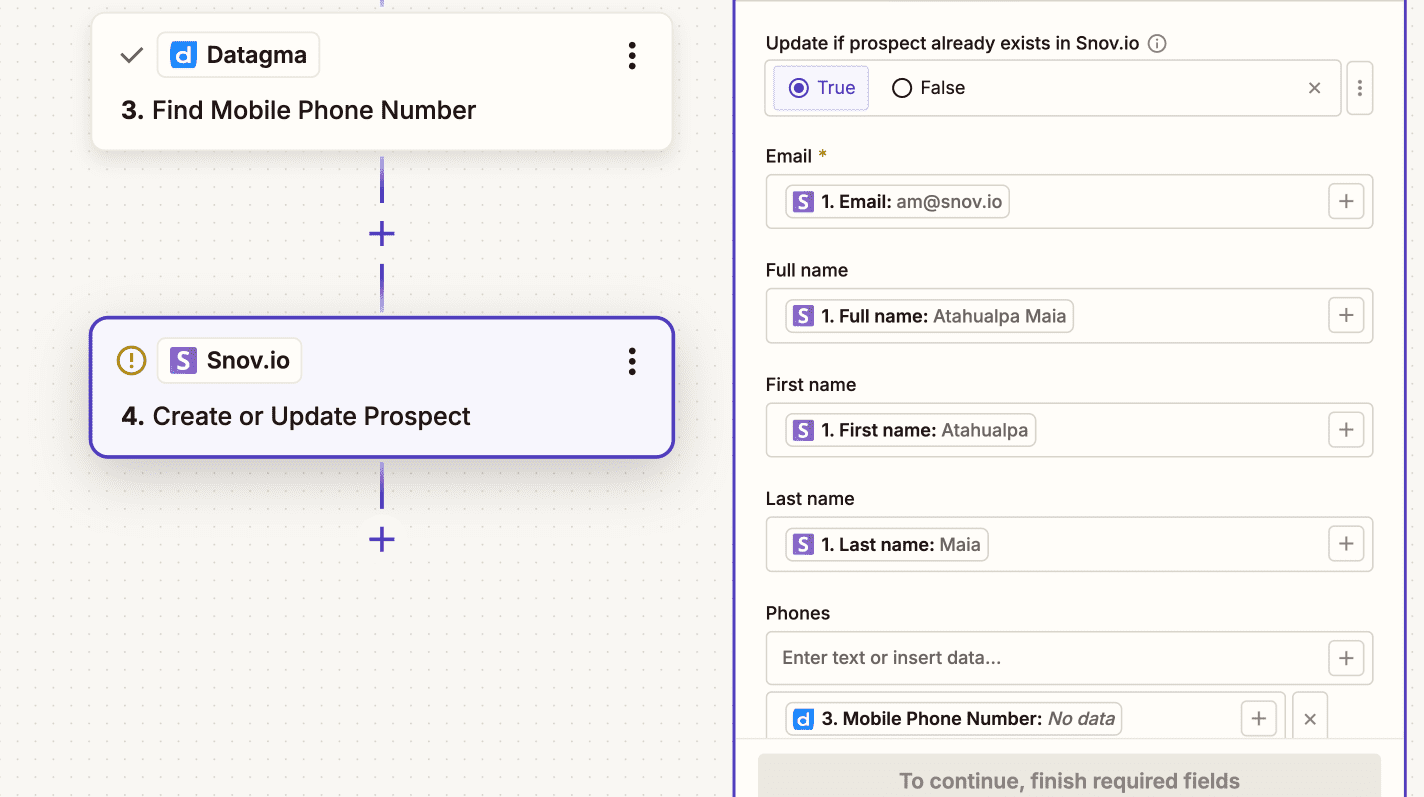 Add the next action step. It will update the prospect’s profile in your Snov.io list with the phone number.