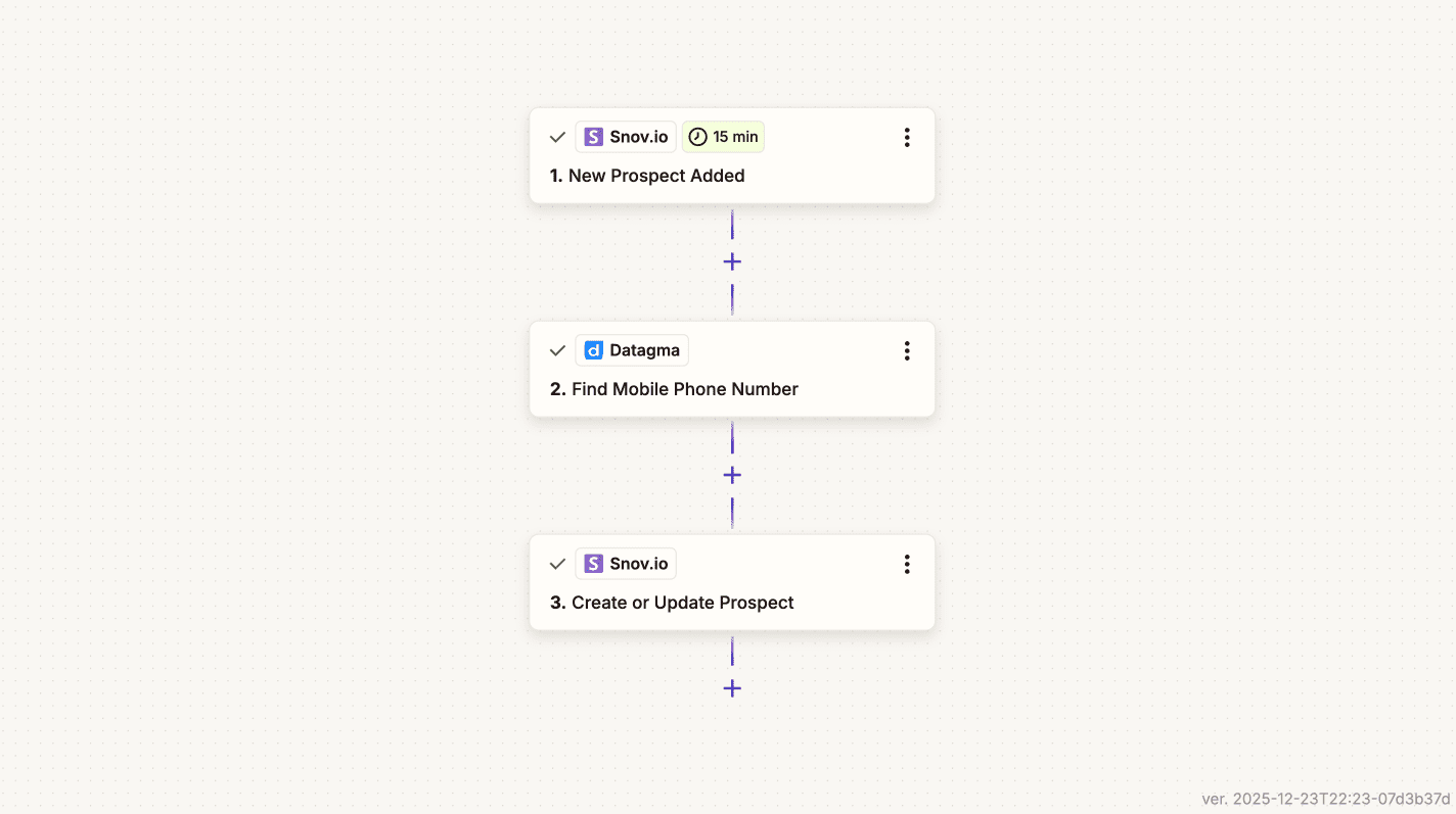 This guide shows how to build a workflow that automatically enriches mobile/direct phone numbers for new prospects added to your Snov.io list.