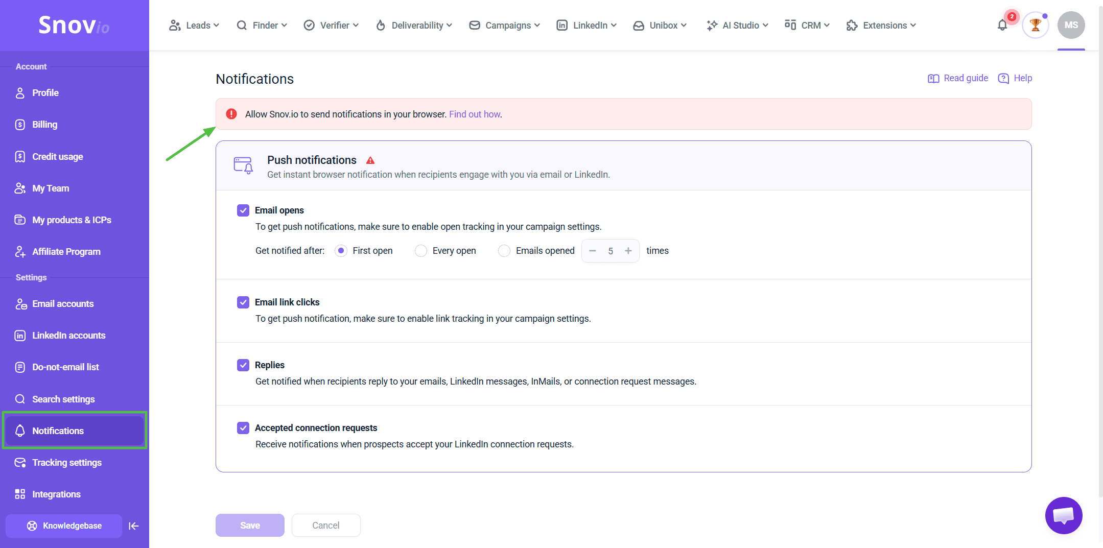 Click Save at the bottom to apply your settings. Then, make sure to allow Snov.io to send notifications in your browser to complete the setup.