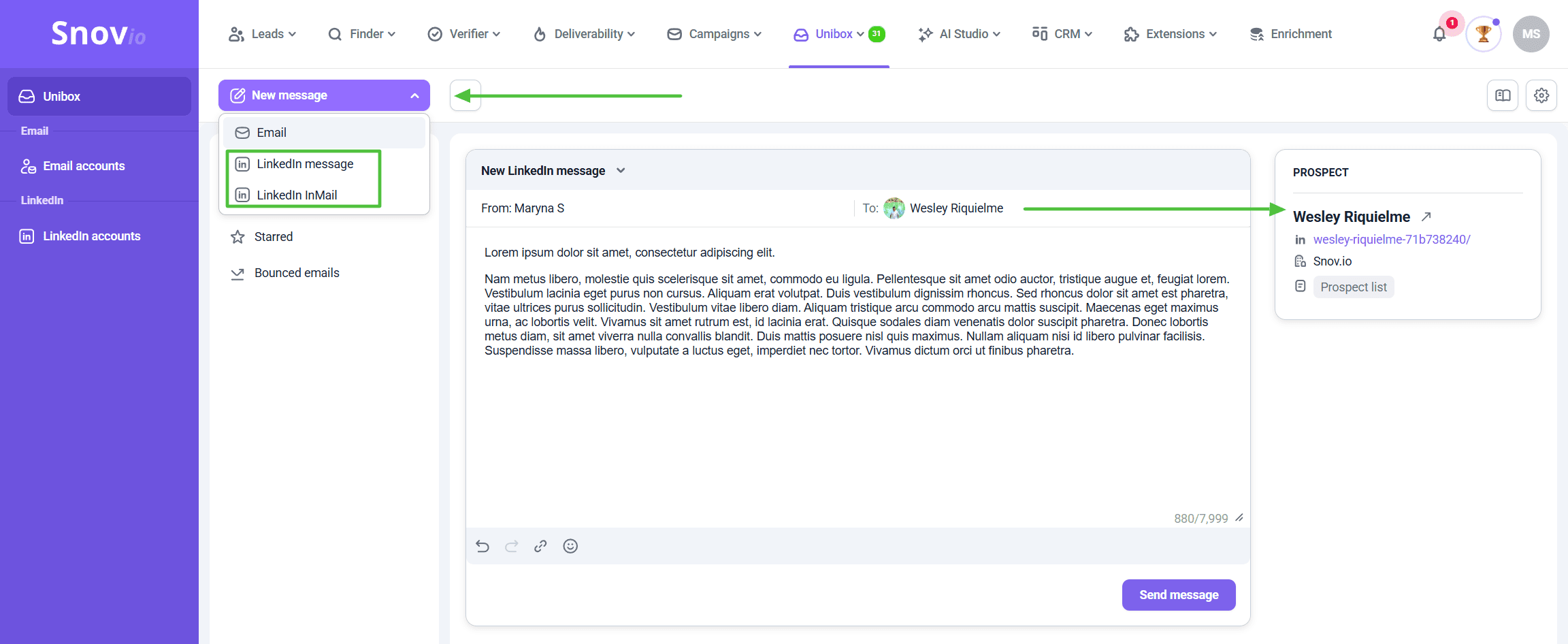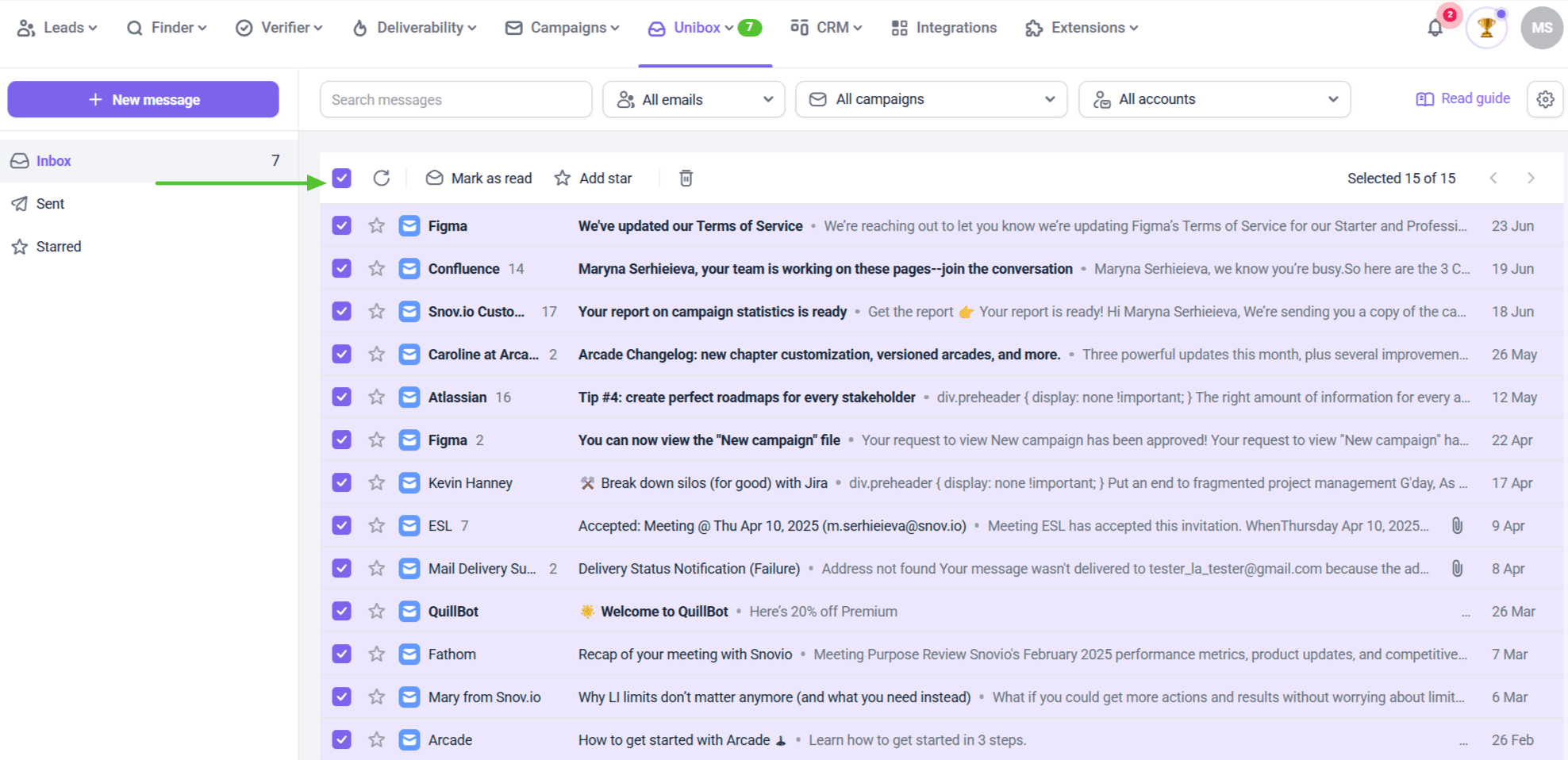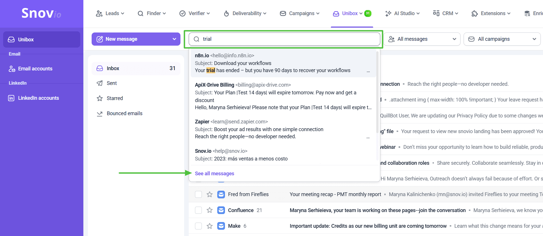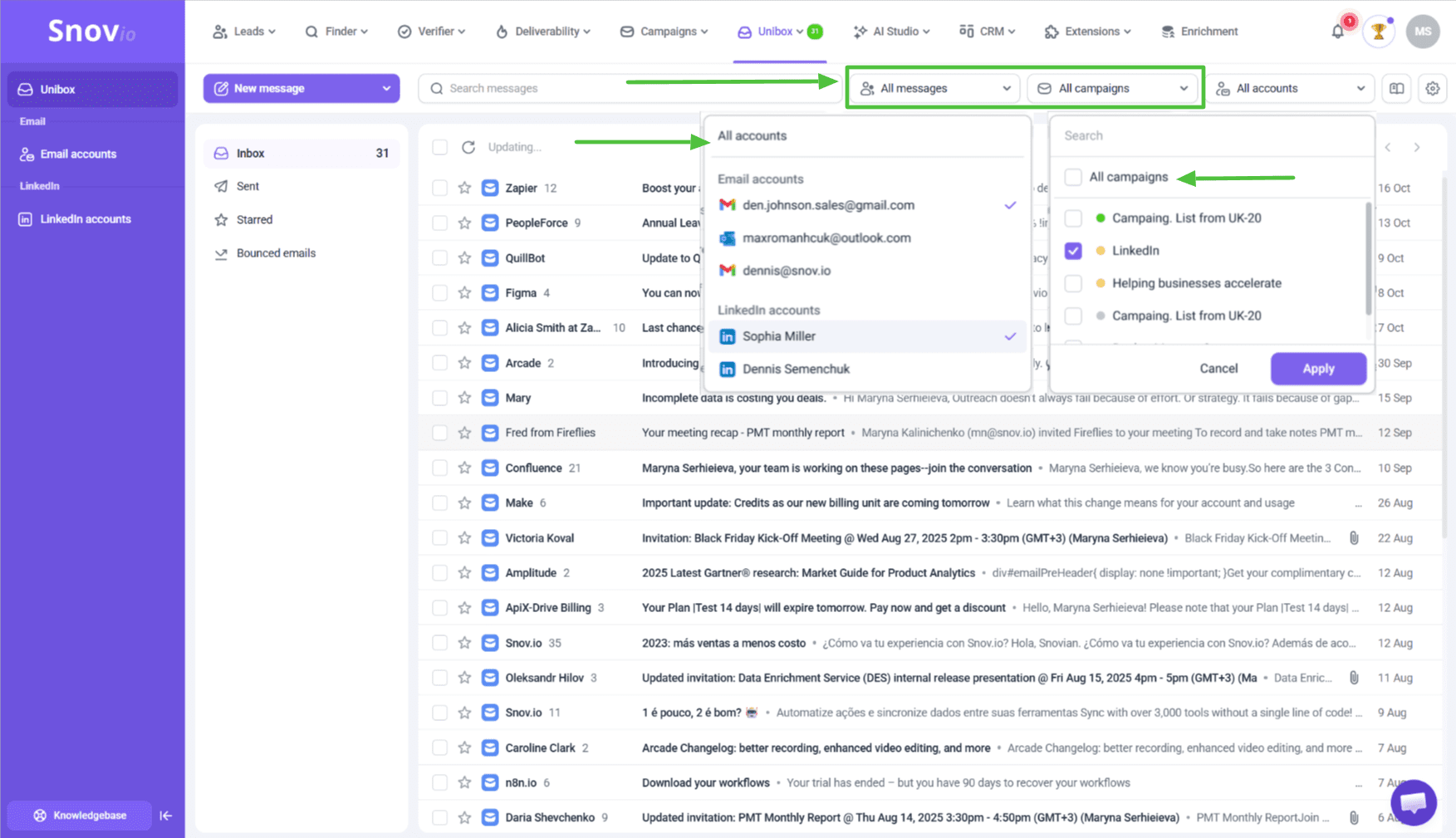 - Click the All messages drop-down on top to choose whether your inbox shows all messages or threads with Snov.io prospects only .