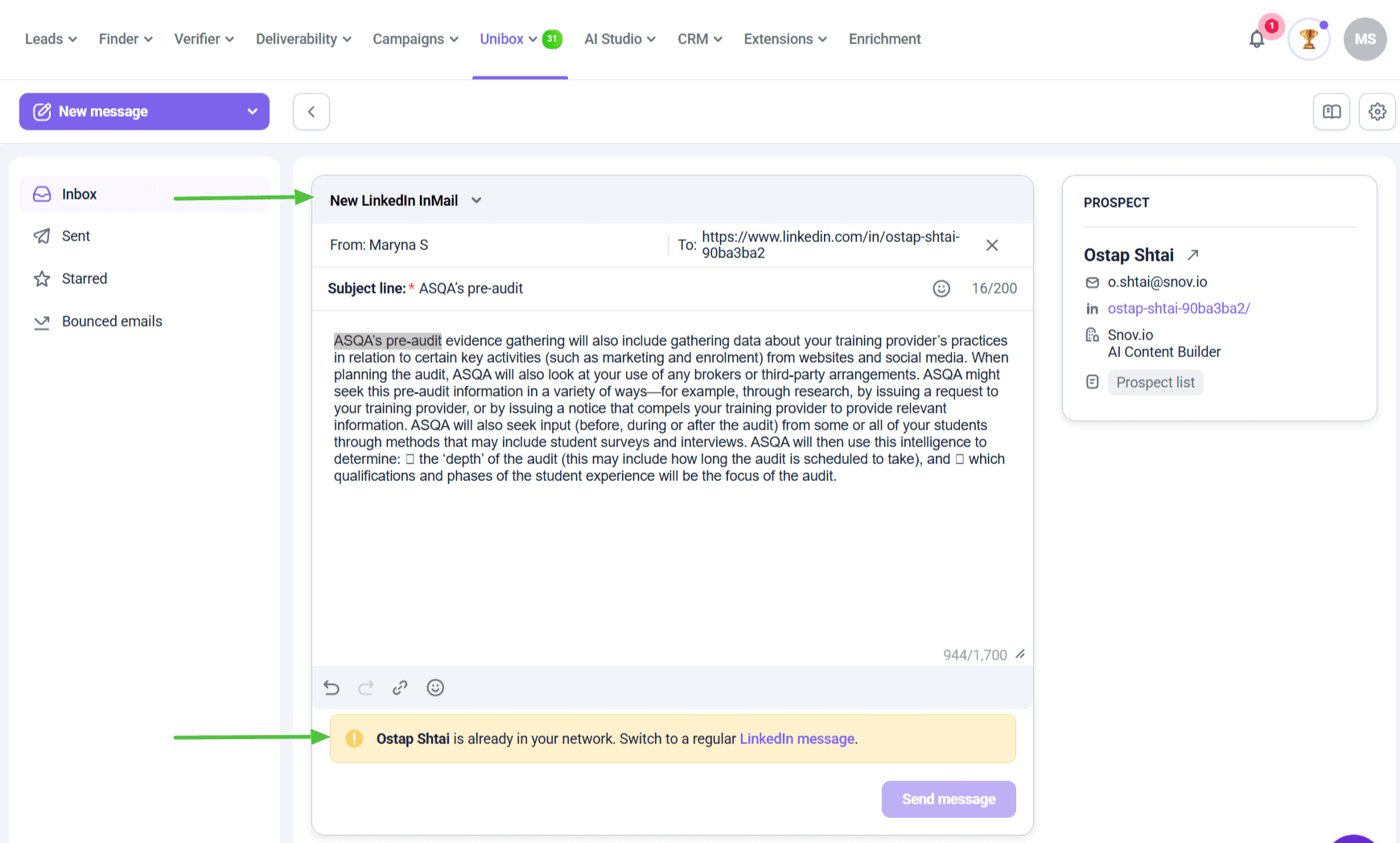 - Inbox contains all incoming messages, both emails and LinkedIn, synced from your connected accounts, including replies received within campaigns