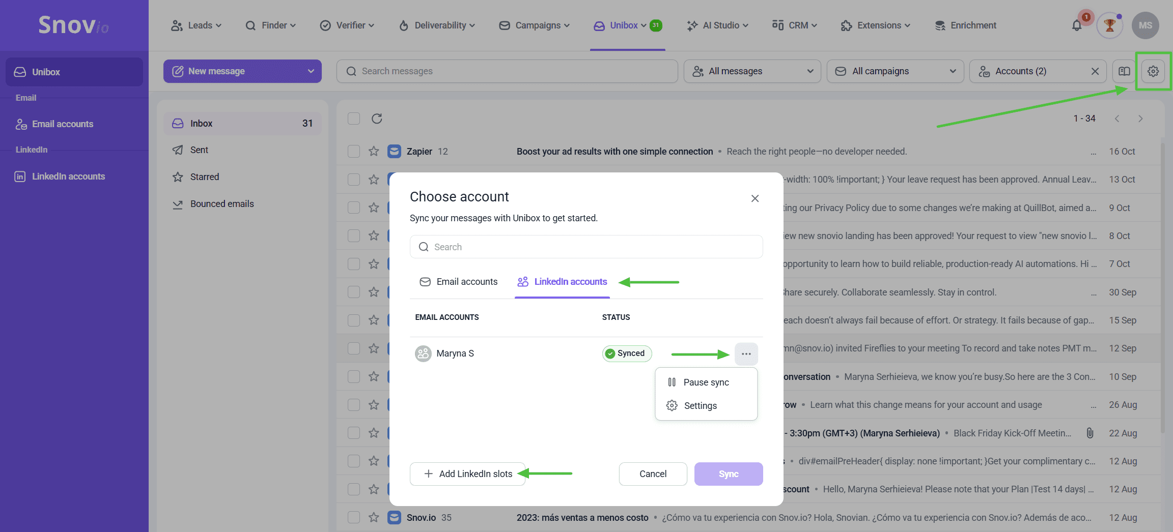In the top right corner, the settings icon opens the list of all connected accounts, where you can see their status or pause syncing if necessary.