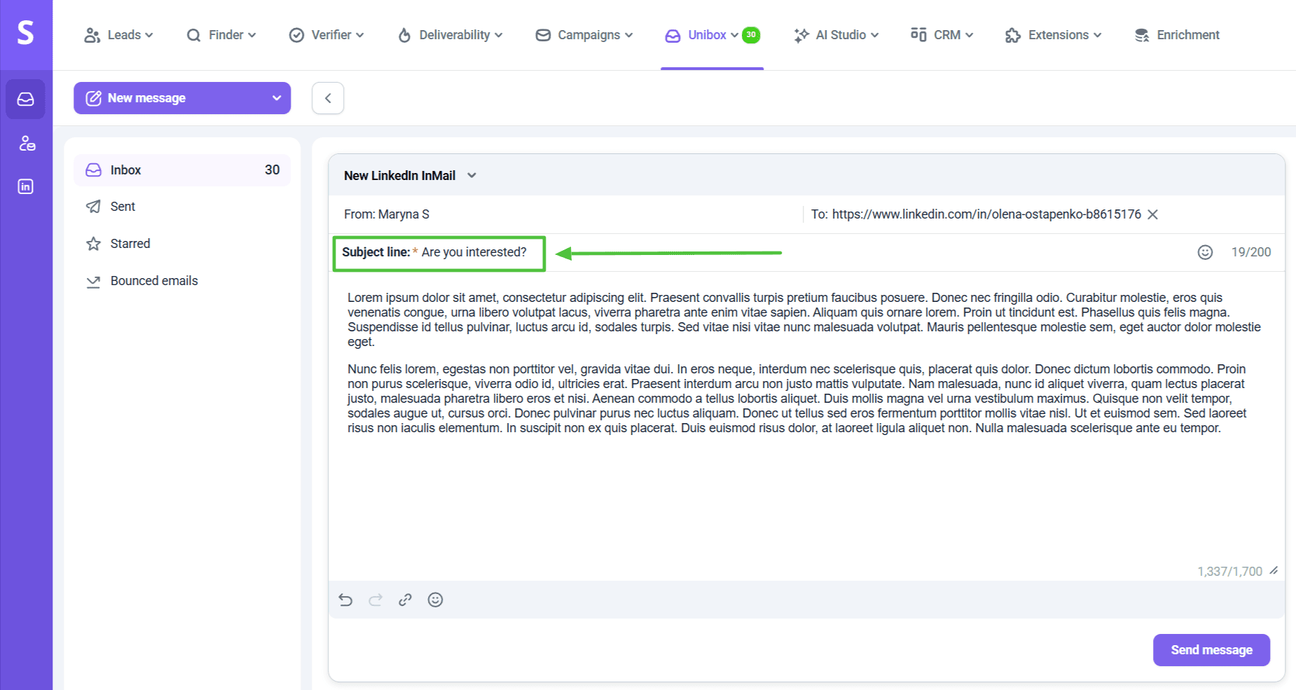 For LinkedIn InMail, adding a subject line is mandatory. Select your account to send from and the prospect to contact. Also, you can enter a profile URL if you aren’t connected with the prospect on LinkedIn. The character limit is 1,700.