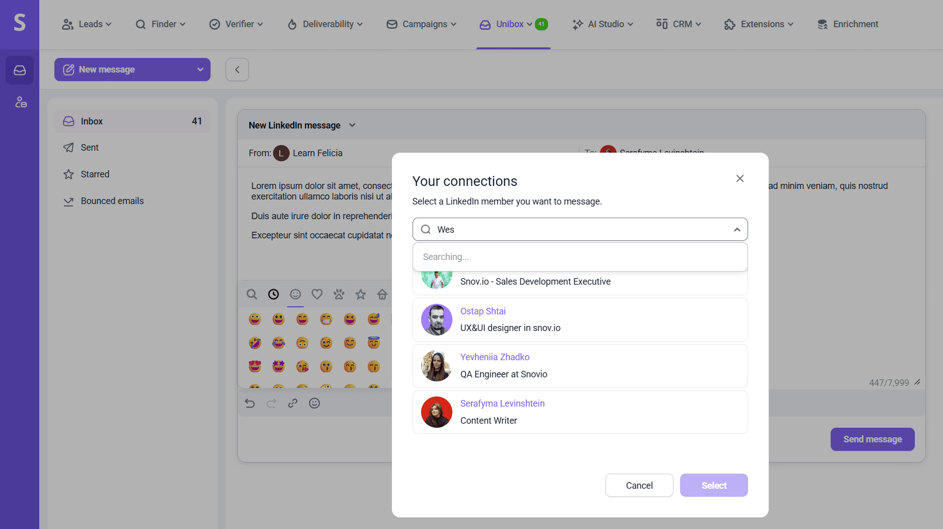 When you enter an email into the recipient field, Unibox checks your prospect lists for an existing contact, allowing you to select one if found. If no match is found, you can still send a one-off outreach email from your Snov.io mailbox. Later, if you decide to add that prospect to a list, you can do it directly from Unibox at any time.
