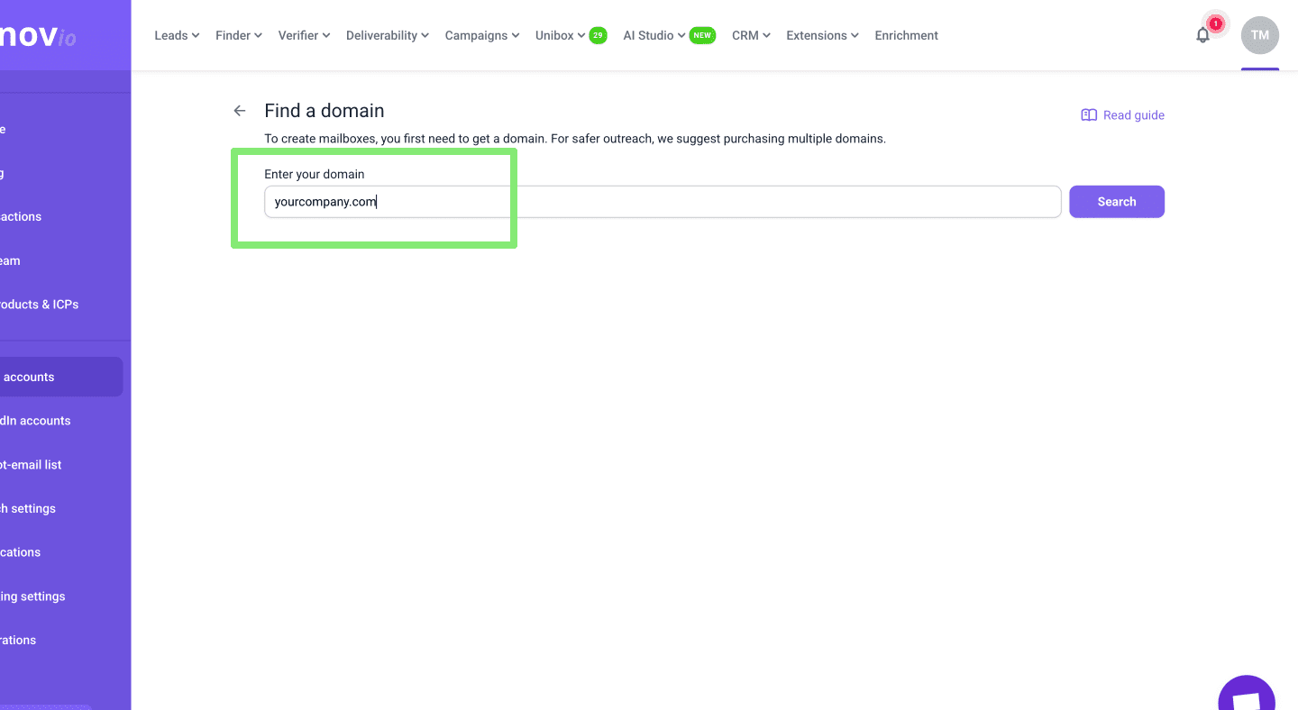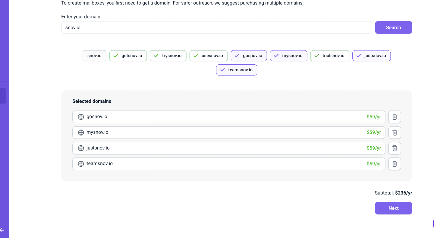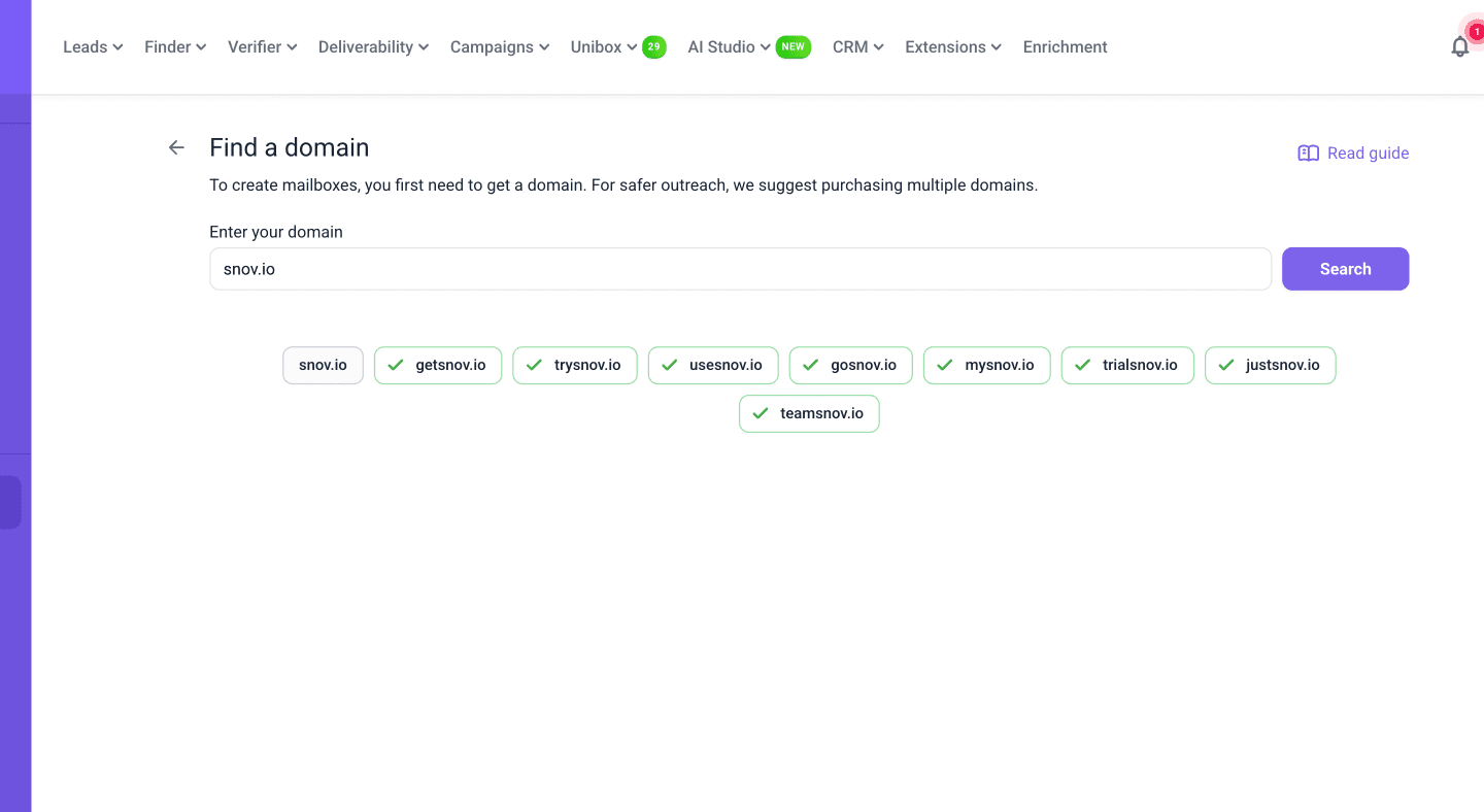 Besides connecting your existing accounts, Snov.io offers done-for-you (DFY) domains and mailboxes.