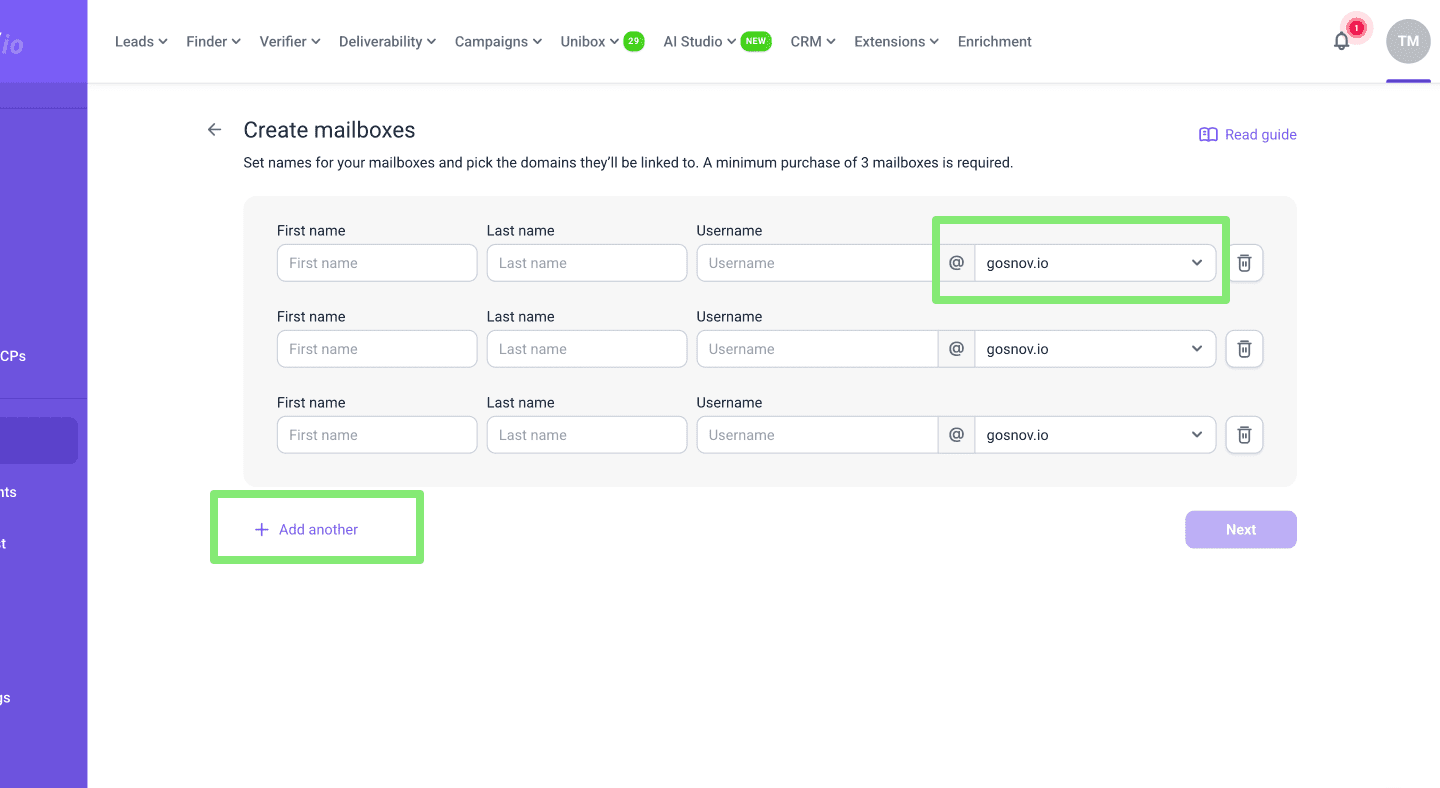 Adding more than 5 mailboxes to one domain is possible, but not recommended. Providers may treat such domains as spammy, which can hurt deliverability.