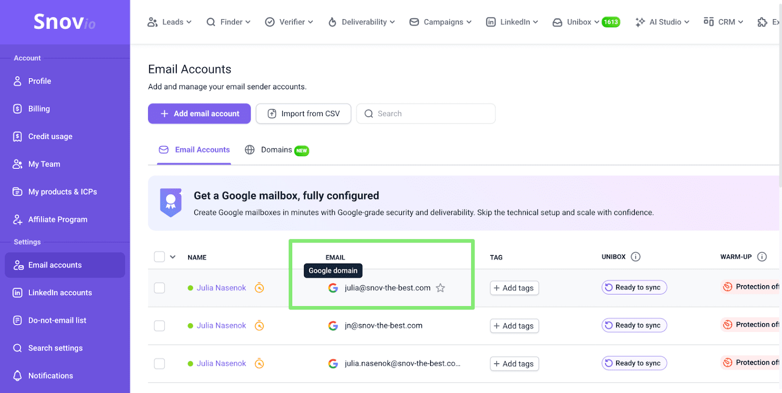 For many teams building a stable sending infrastructure for cold outreach causes a lot of friction. This is why besides connecting your existing accounts, Snov.io offers done-for-you Google mailboxes.
