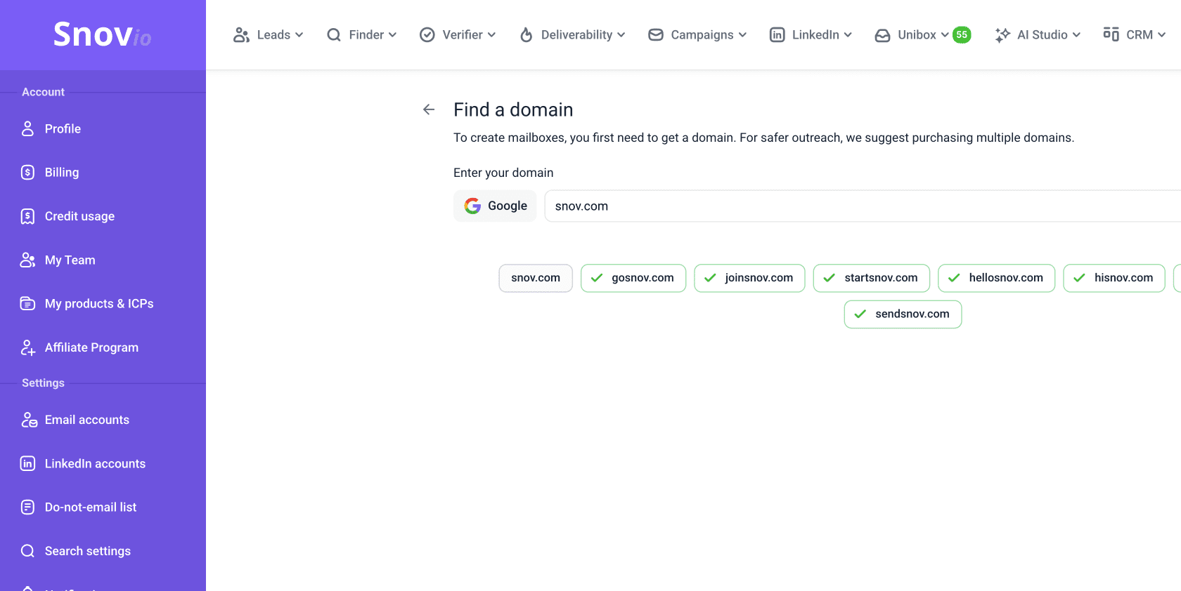Using this option, you can buy domains and create Google email senders in bulk directly from your Snov.io dashboard.