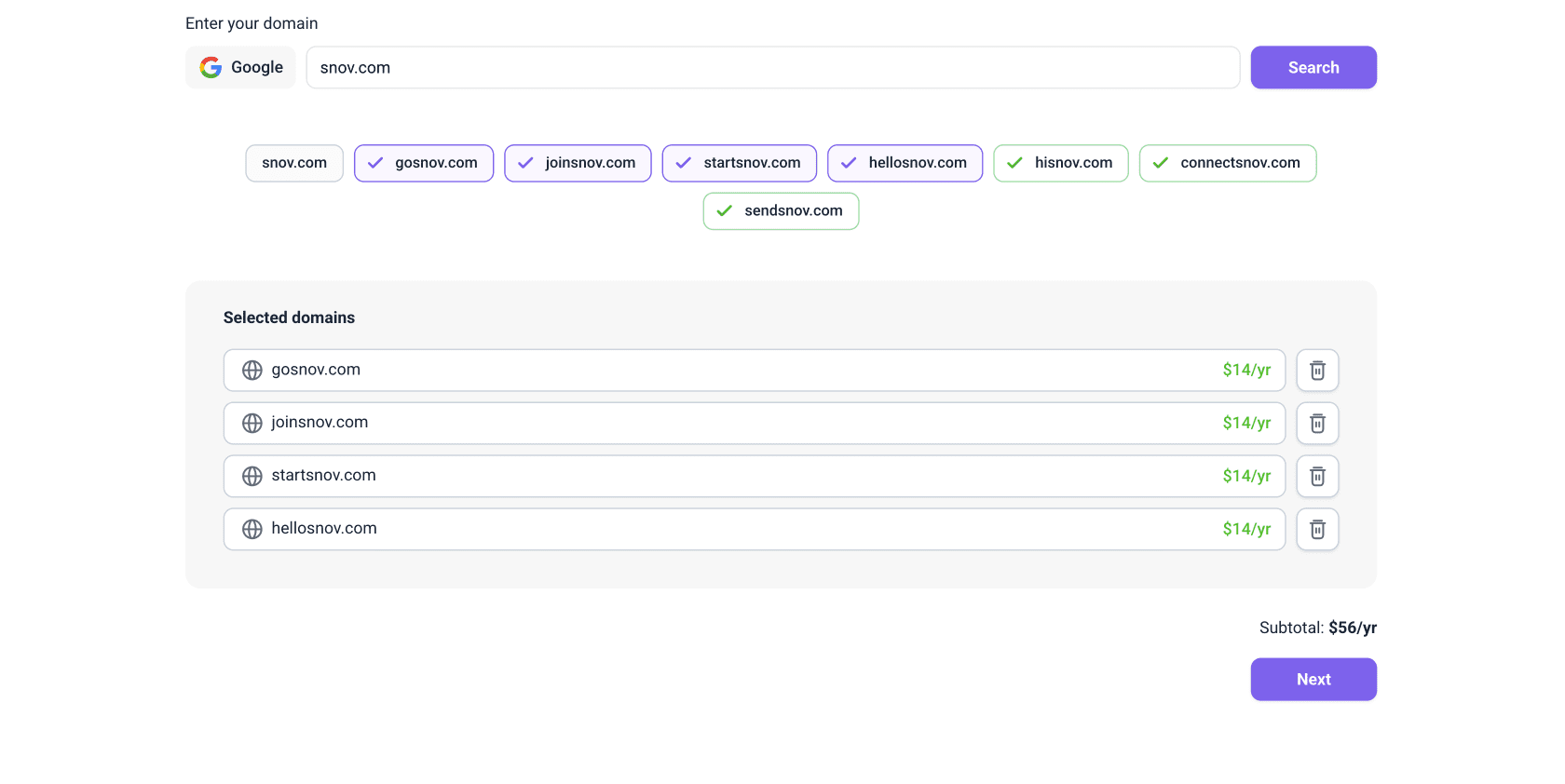 Enter your primary domain to the field. Snov.io will suggest a list of lookalike domain names you can choose from.