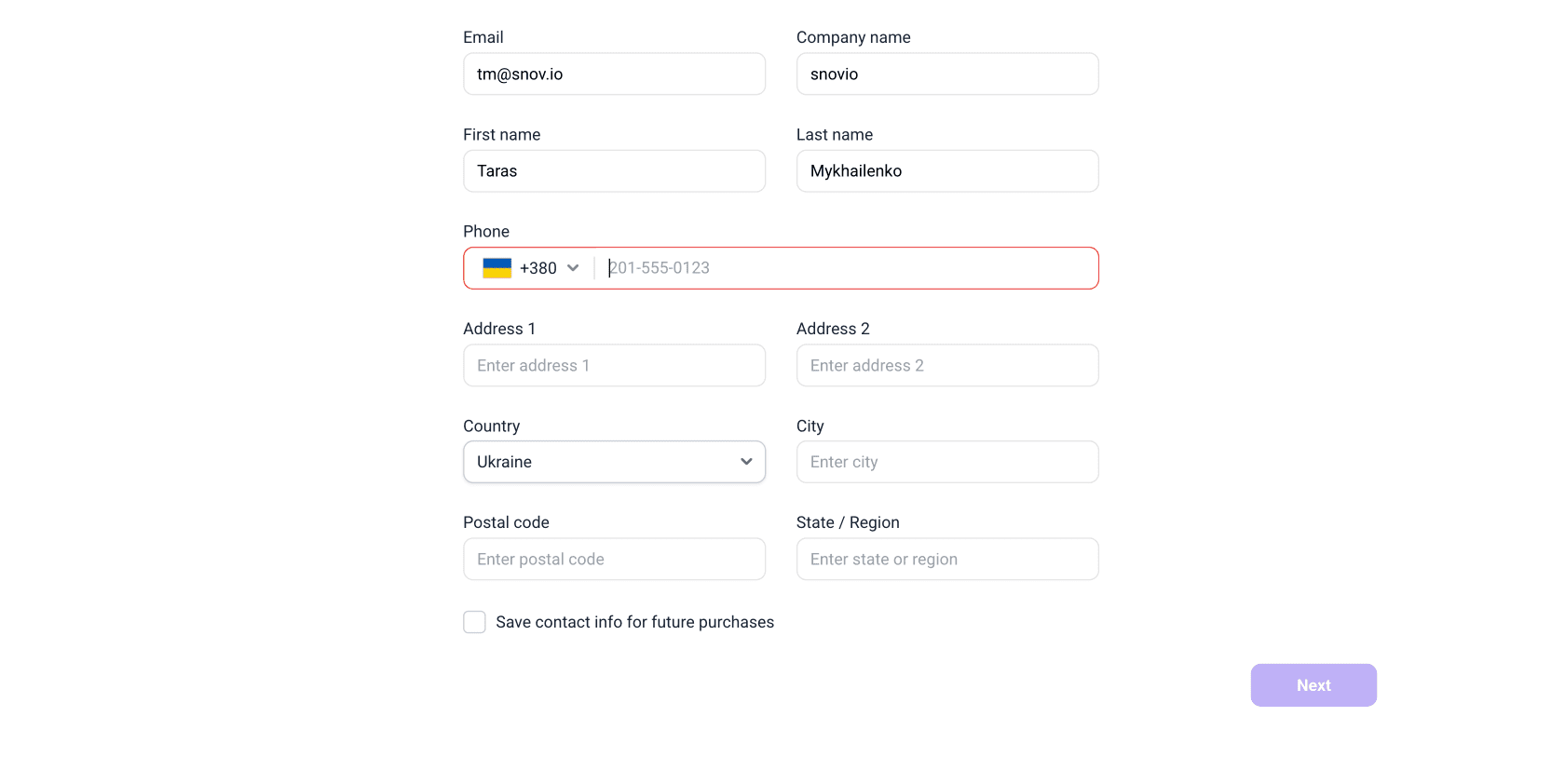 Enter your email, company name, full name, phone number, and address. Check the box to save contact info for future purchases to reuse these details next time.