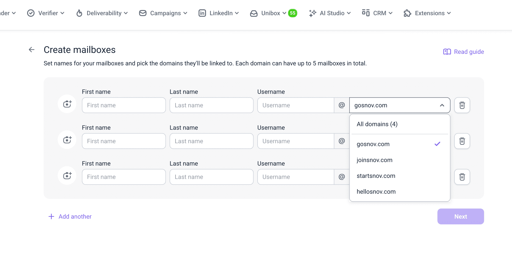 You can start with 3 mailboxes on one domain and add more on the same domain later. Click Add another to create more mailboxes at once.