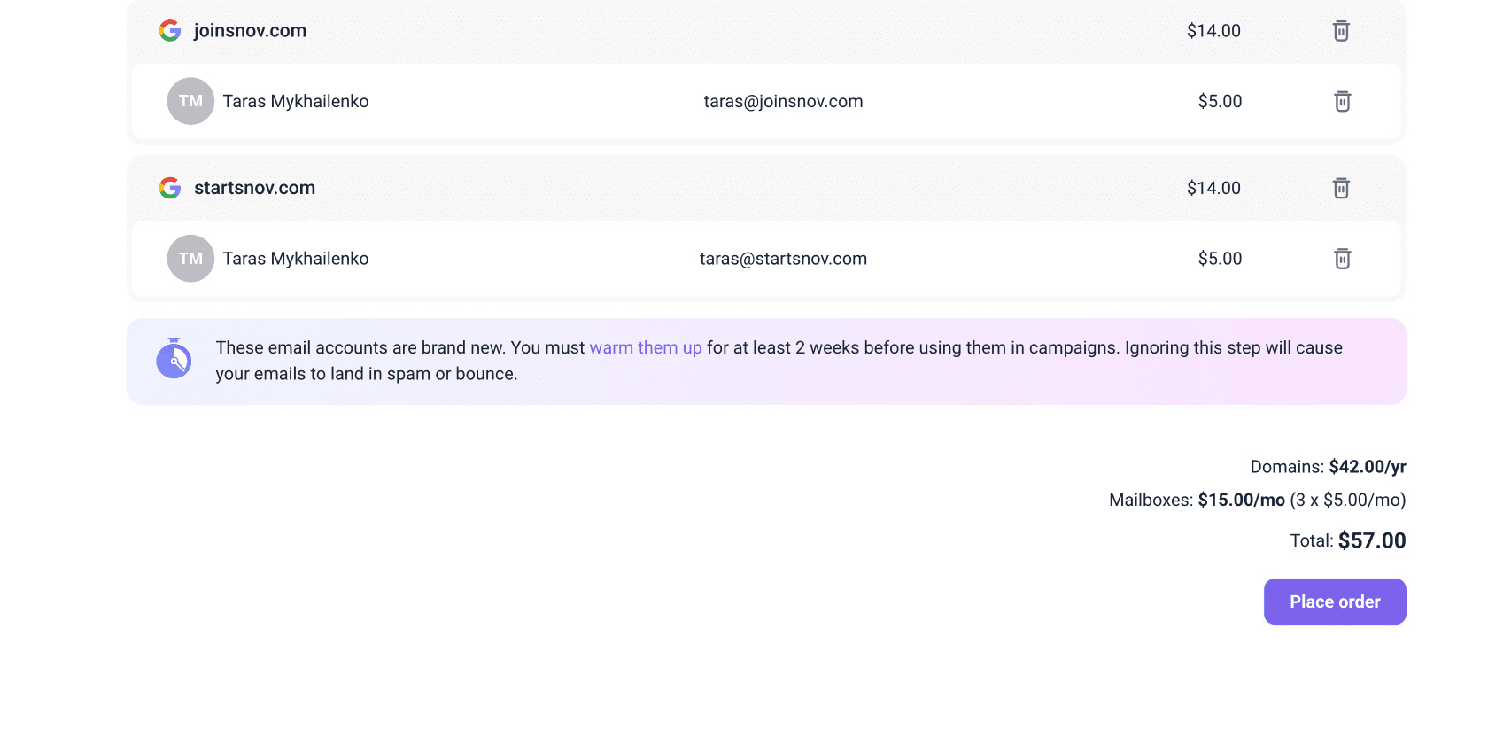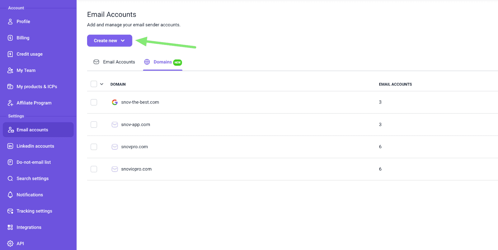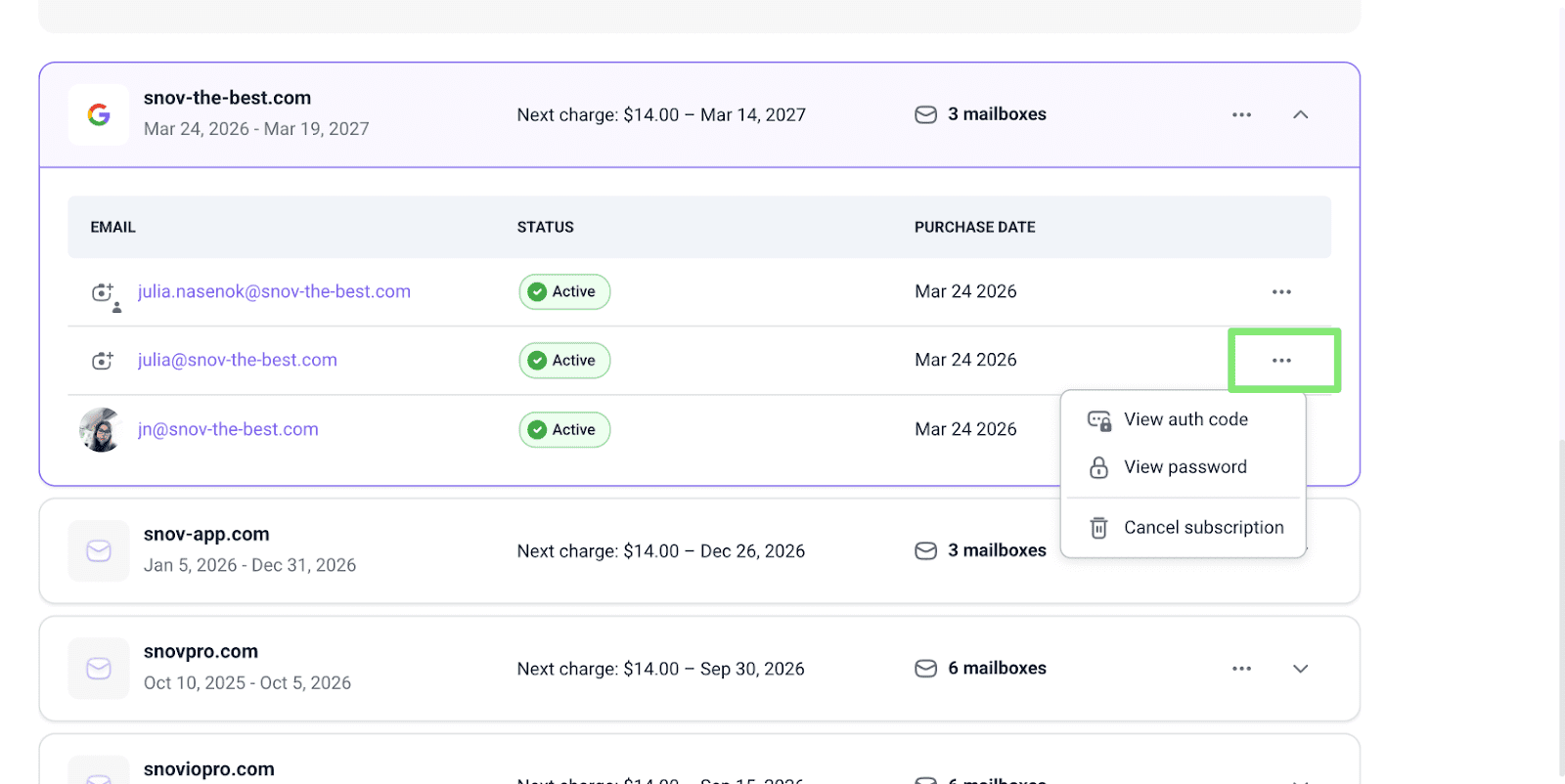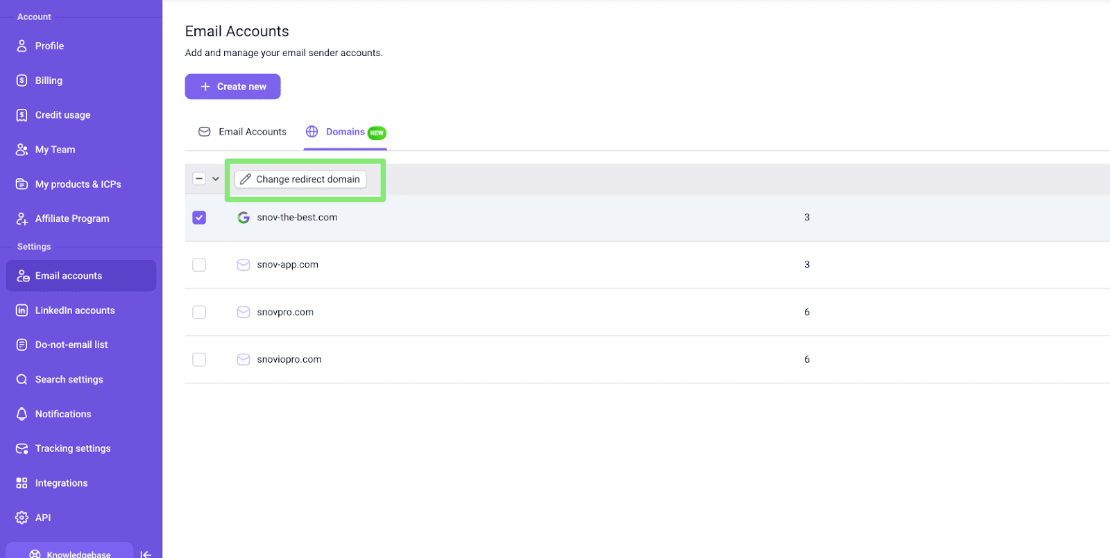 2) Domains and mailboxes are non-refundable. You keep the full ownership of purchased domains and accounts even outside of Snov.io