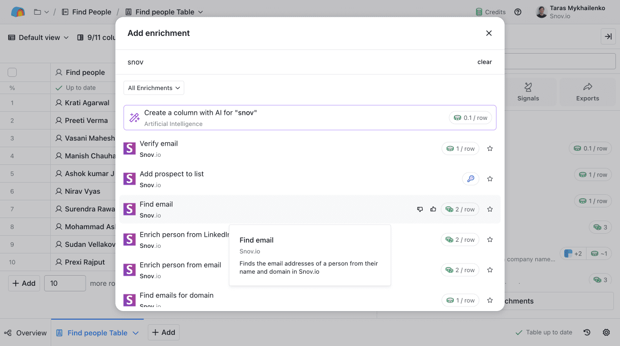 When building Clay tables, select Snov.io as your data provider to enrich prospect data and find email addresses.