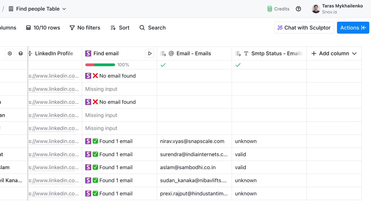 Clay automatically provides these fields when you use it to find people, and Snovio can then enrich those profiles with a verified email address.
