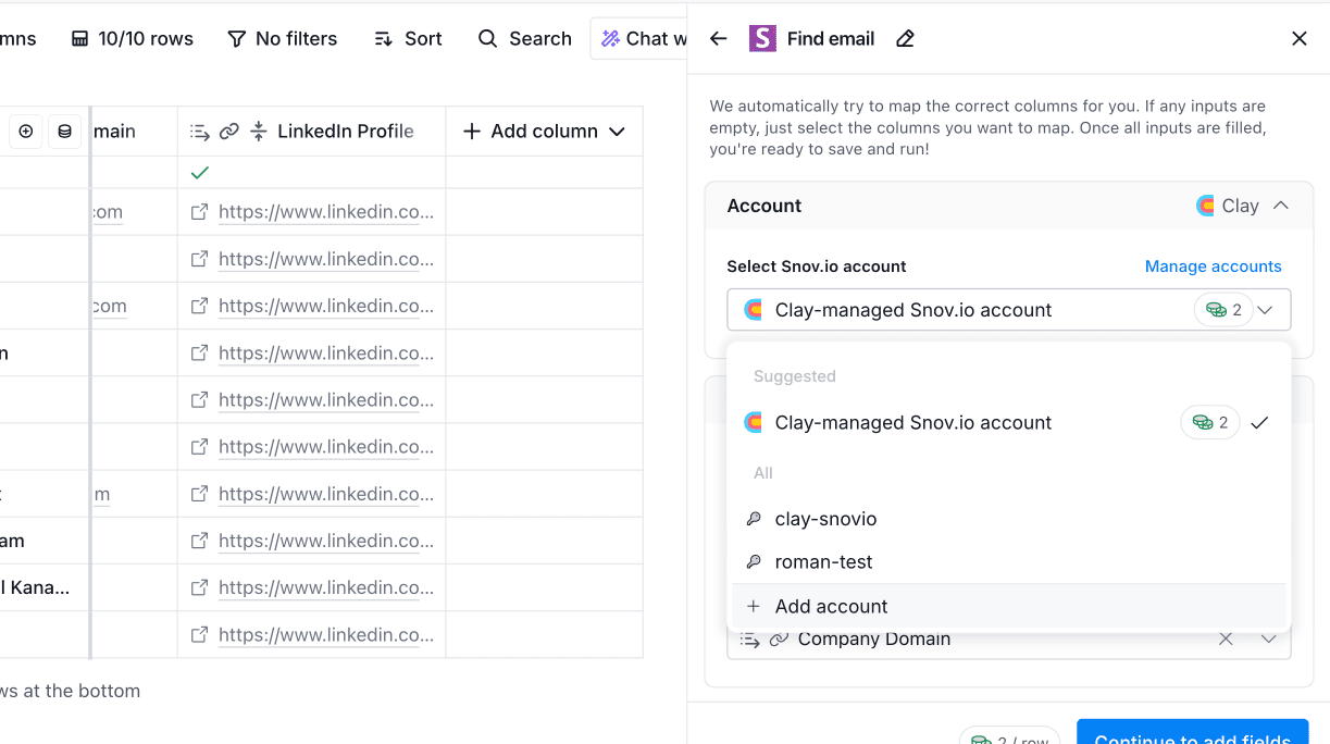Clay automatically maps the columns Snovio needs as inputs for enrichment. Check all required fields under Column mapping in Clay.