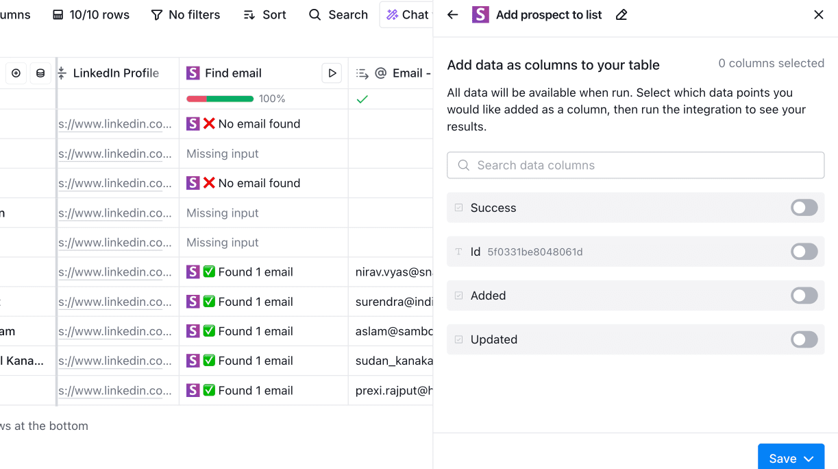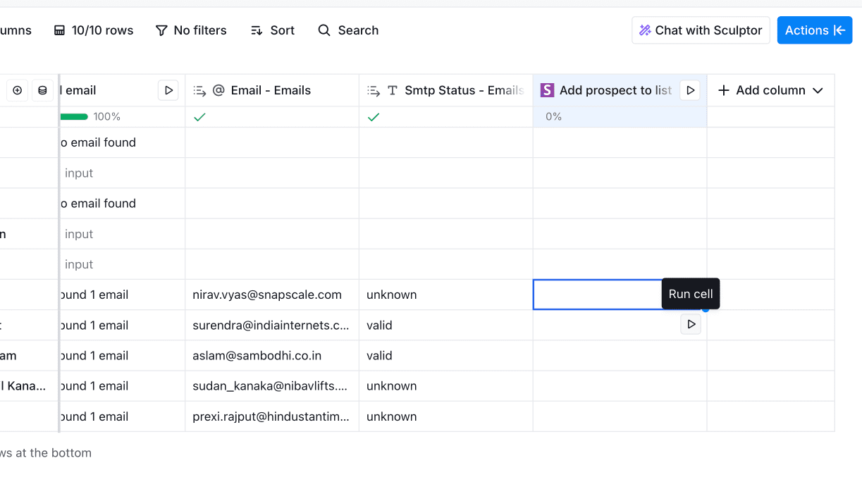 Pick one prospect. In the Add to list column for that row, click Run cell.