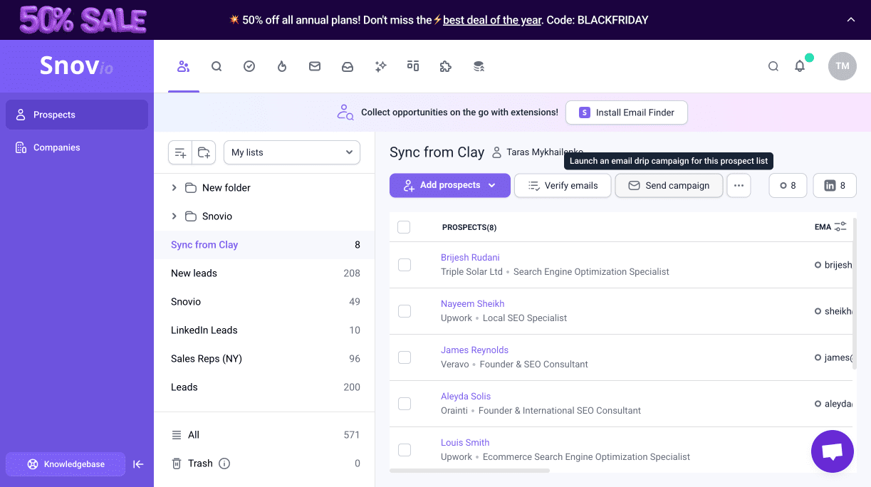 From your prospect list in Snov.io, click Send campaign to create a multichannel sequence.