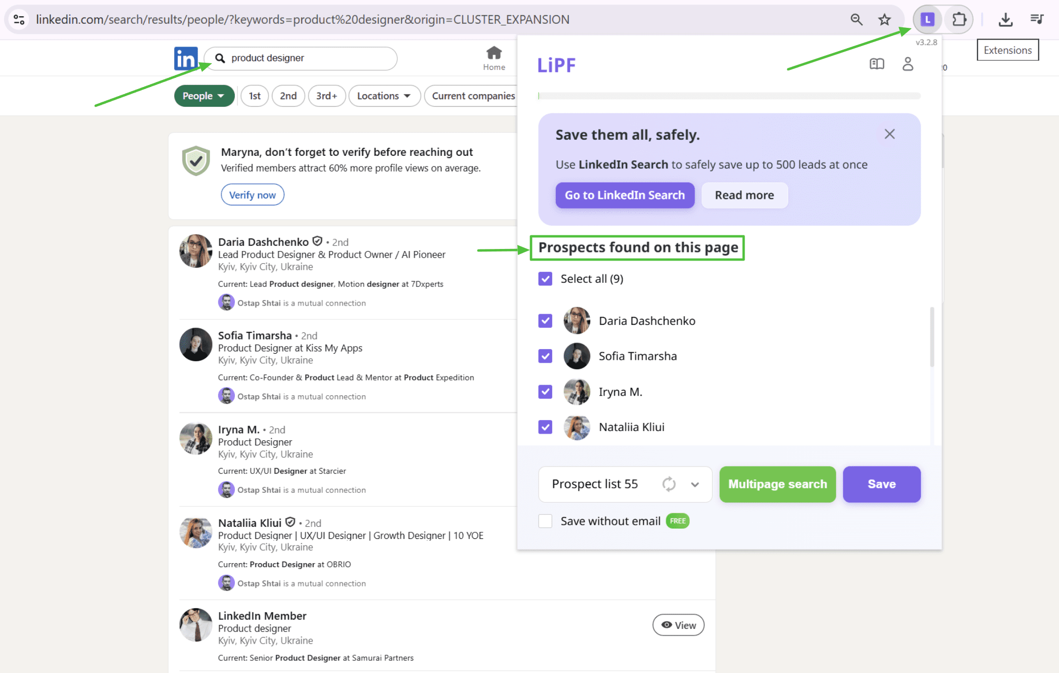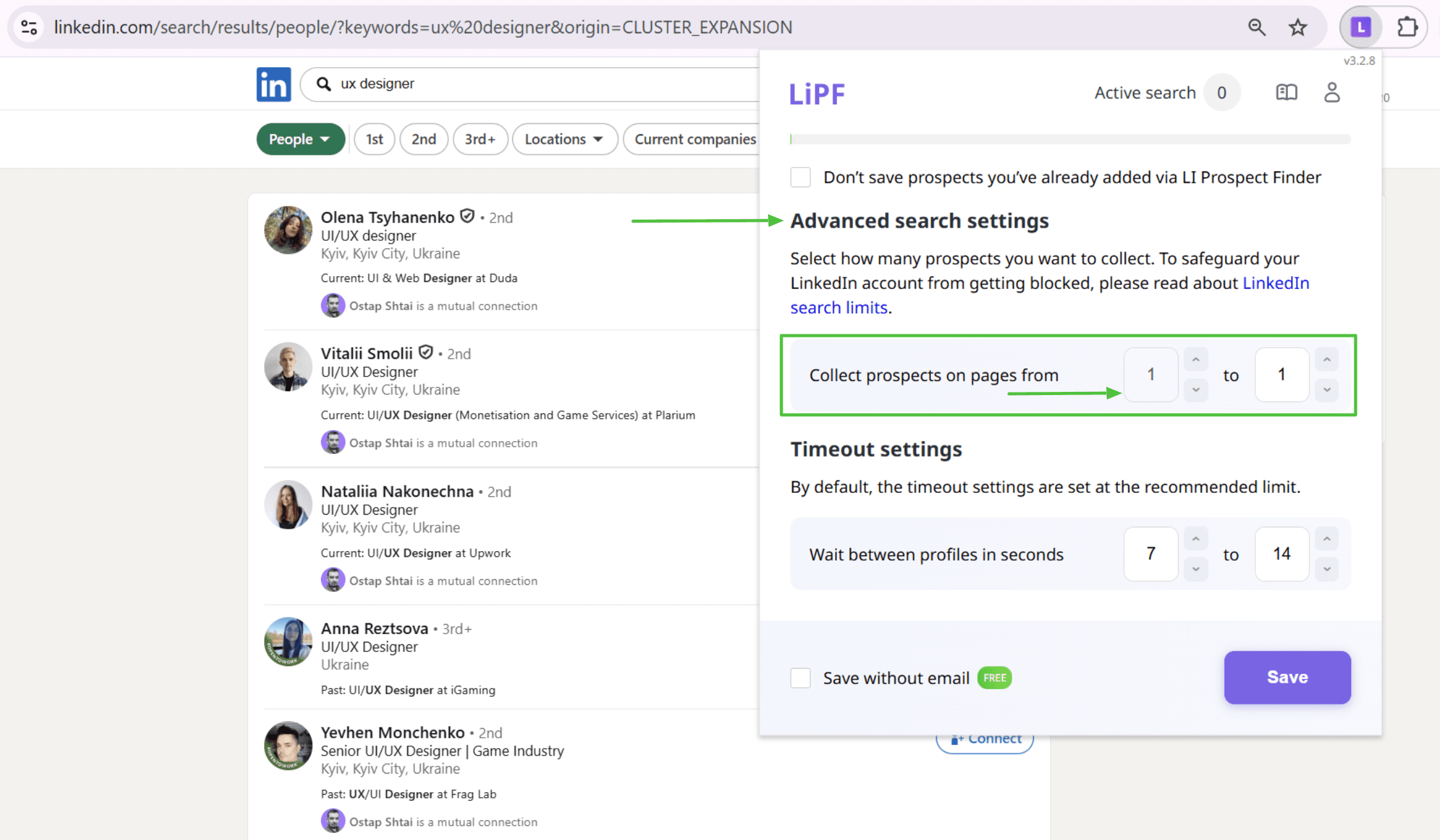 Using LinkedIn Prospect Finder, you can collect prospects and find emails on different LinkedIn pages.