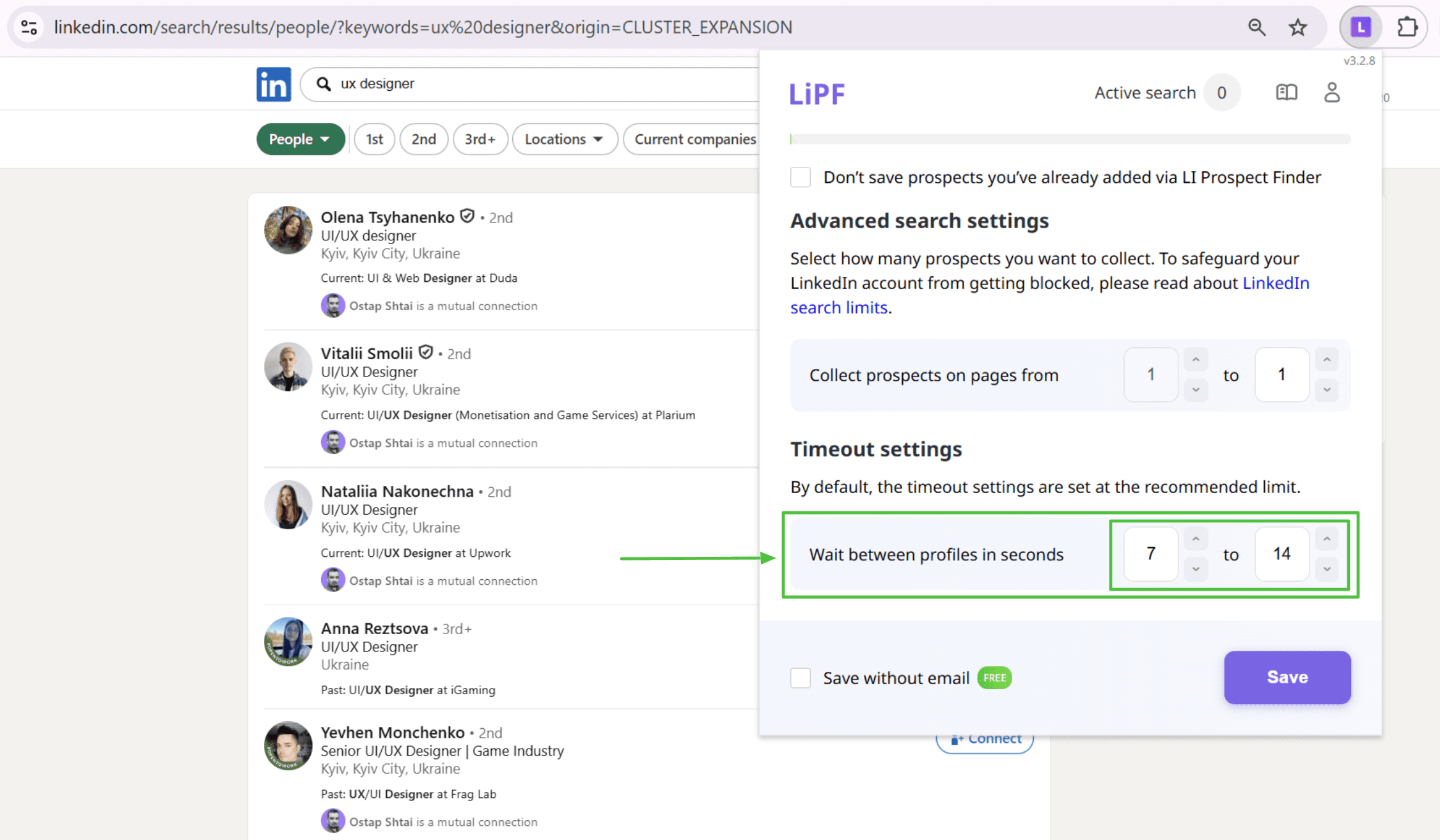 Extension adds random delays (7-14 seconds default) between saving each lead. This makes activity look human, reduces risk of being flagged. Adjust timeout to set longer delays if you want extra caution.