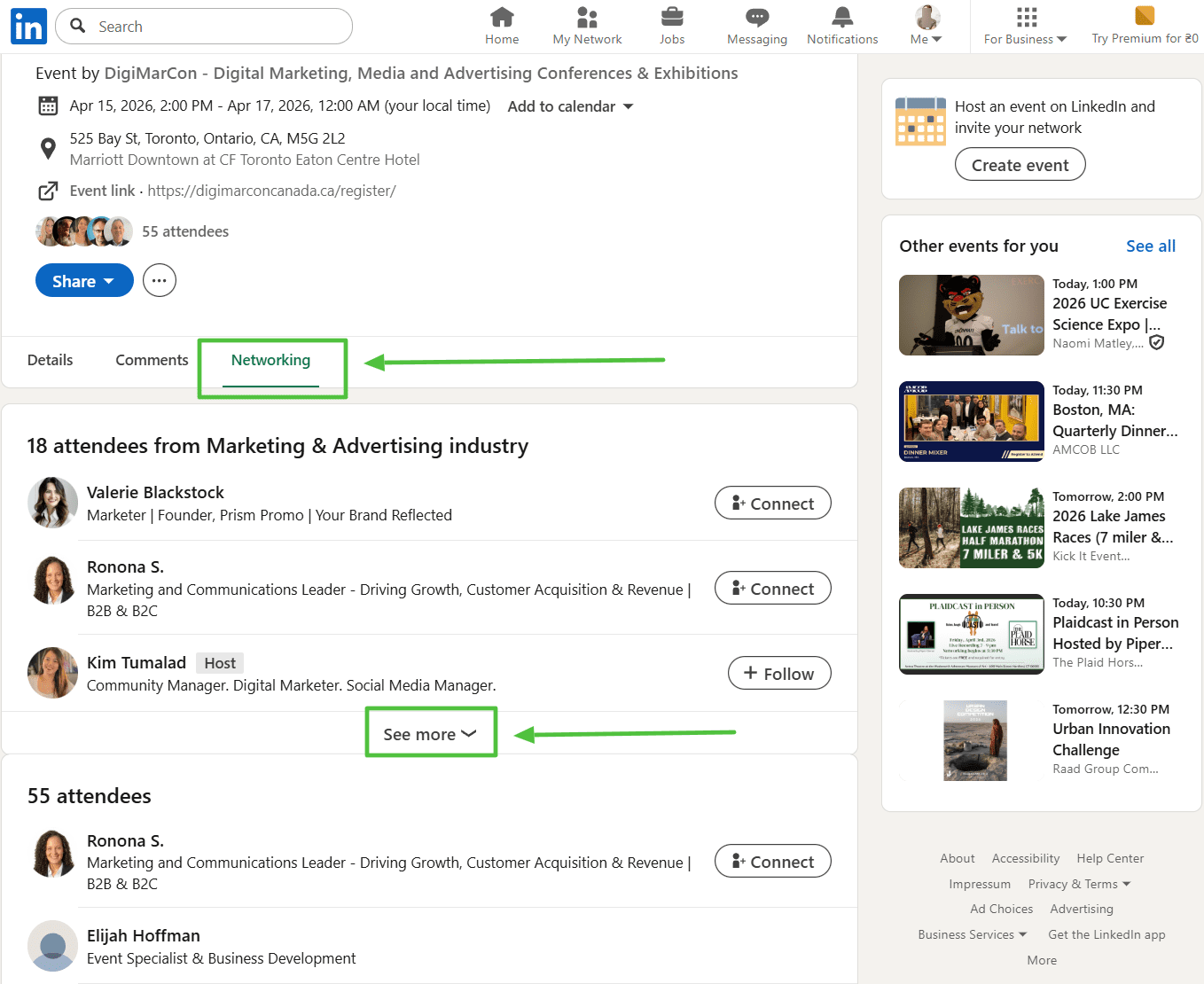 Go to Networking tab in event menu → Scroll down → Click See More to show full attendee list.