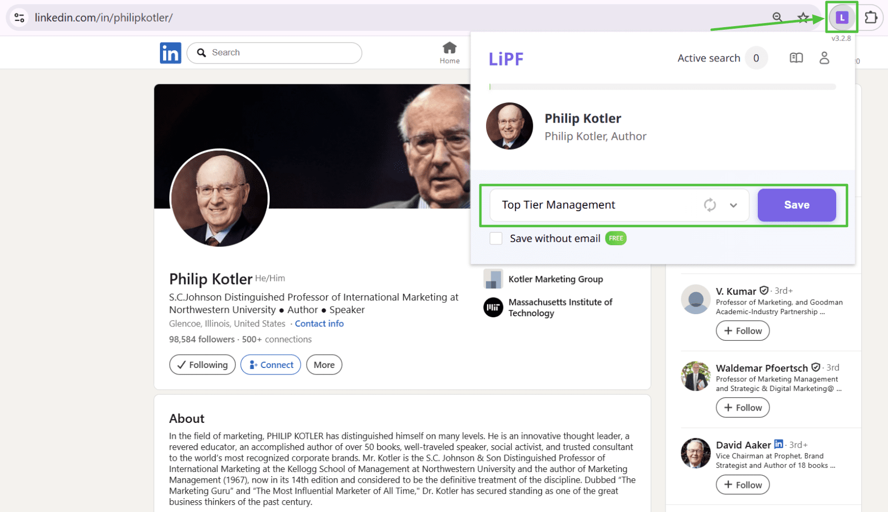 First, find the person using LinkedIn search → Open their profile → Click extension → Click Save.