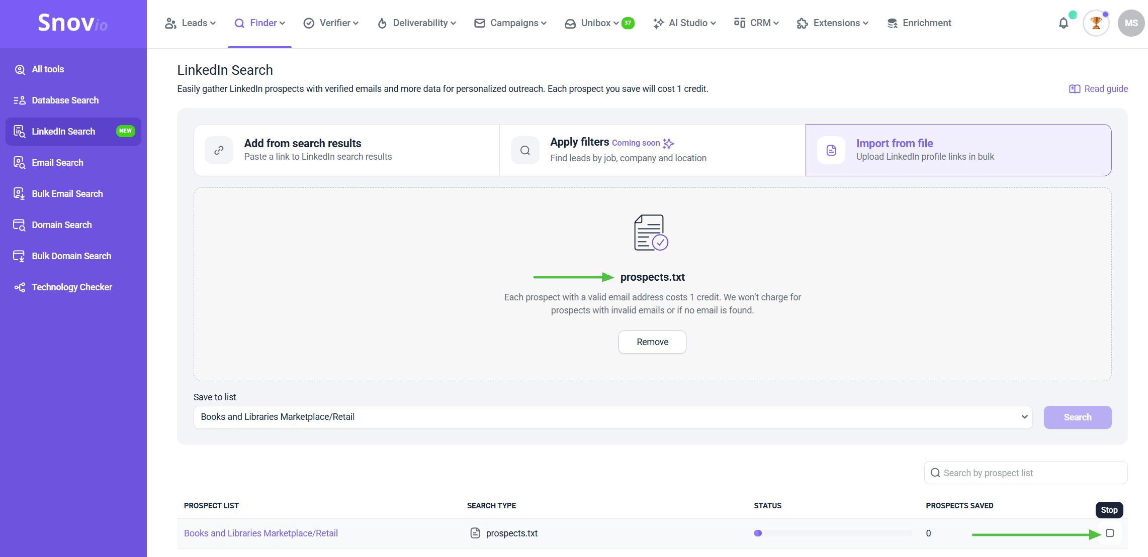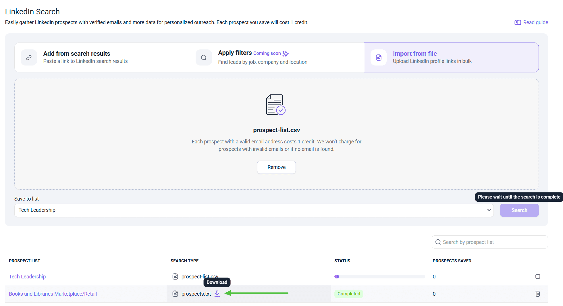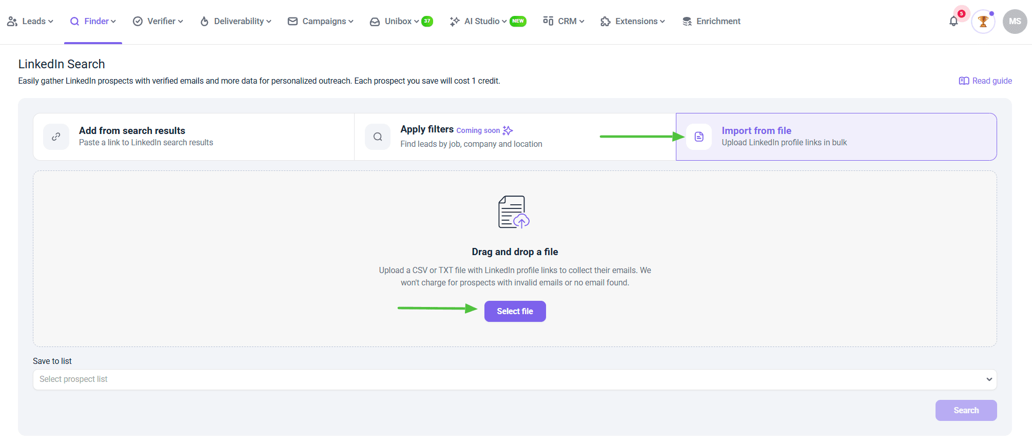 On the LinkedIn Search page, click Import from file tab on the right to upload LinkedIn profile links in bulk.