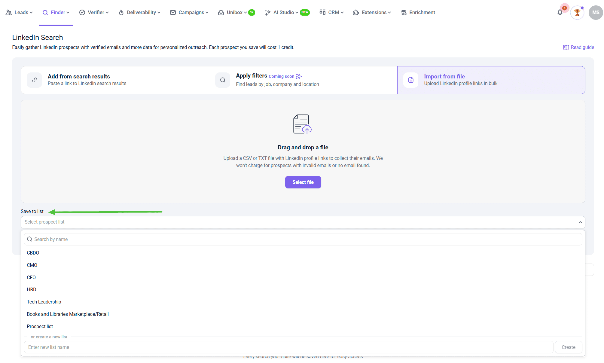 Once you upload the prospect file, select a prospect list where the results will be saved. You can create a new list from the same drop-down menu if needed. You aren’t charged for prospects with invalid emails or no emails found.