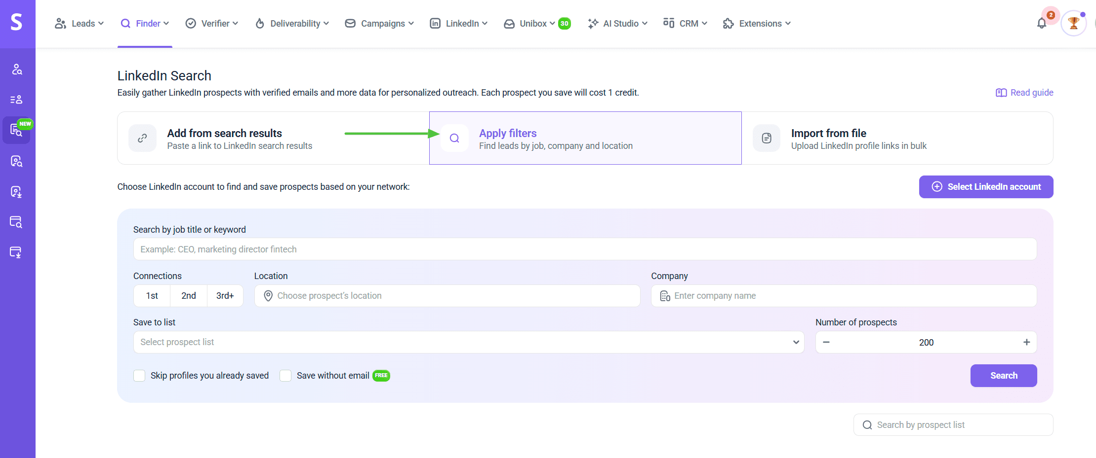 LinkedIn Search complements these tools, giving you advanced options to find leads from LinkedIn directly in your Snov.io account. It offers three different ways to find prospects: