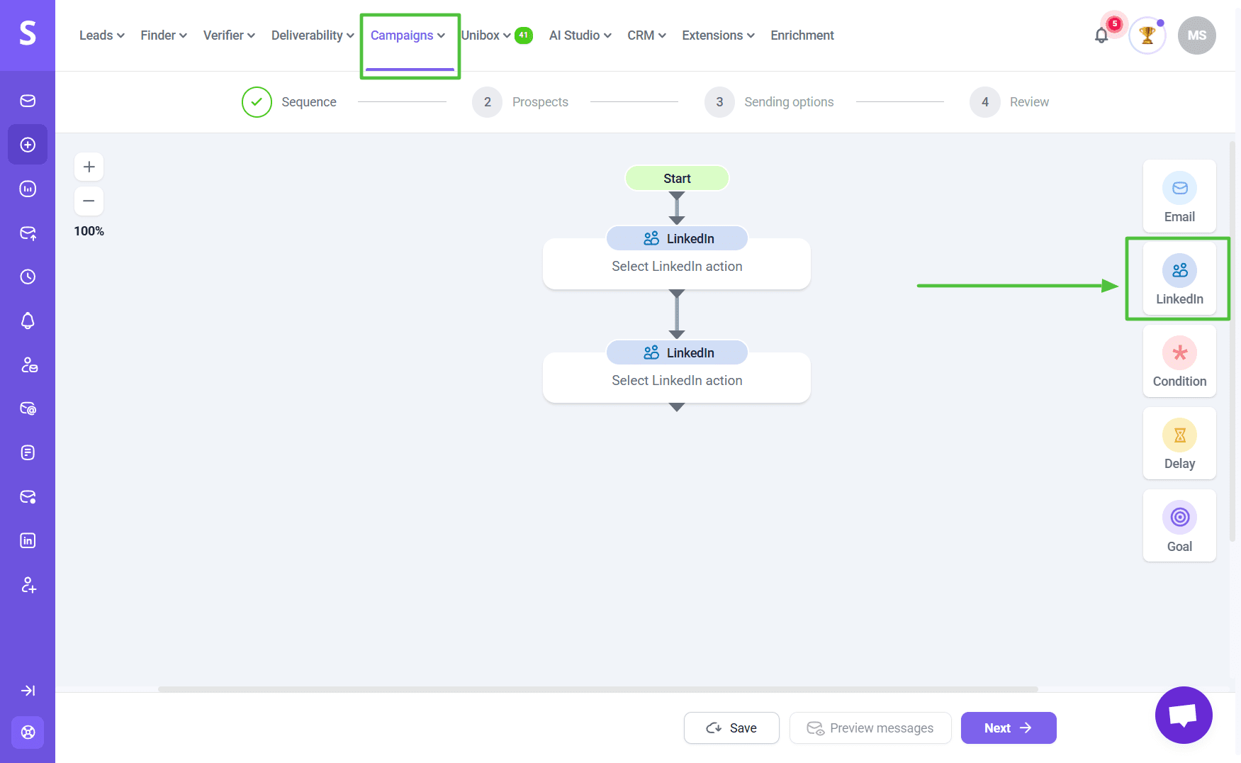 Multichannel campaigns (email + LinkedIn): LinkedIn tasks can also be added to email campaigns, making your outreach multichannel so you get more replies and engagement.