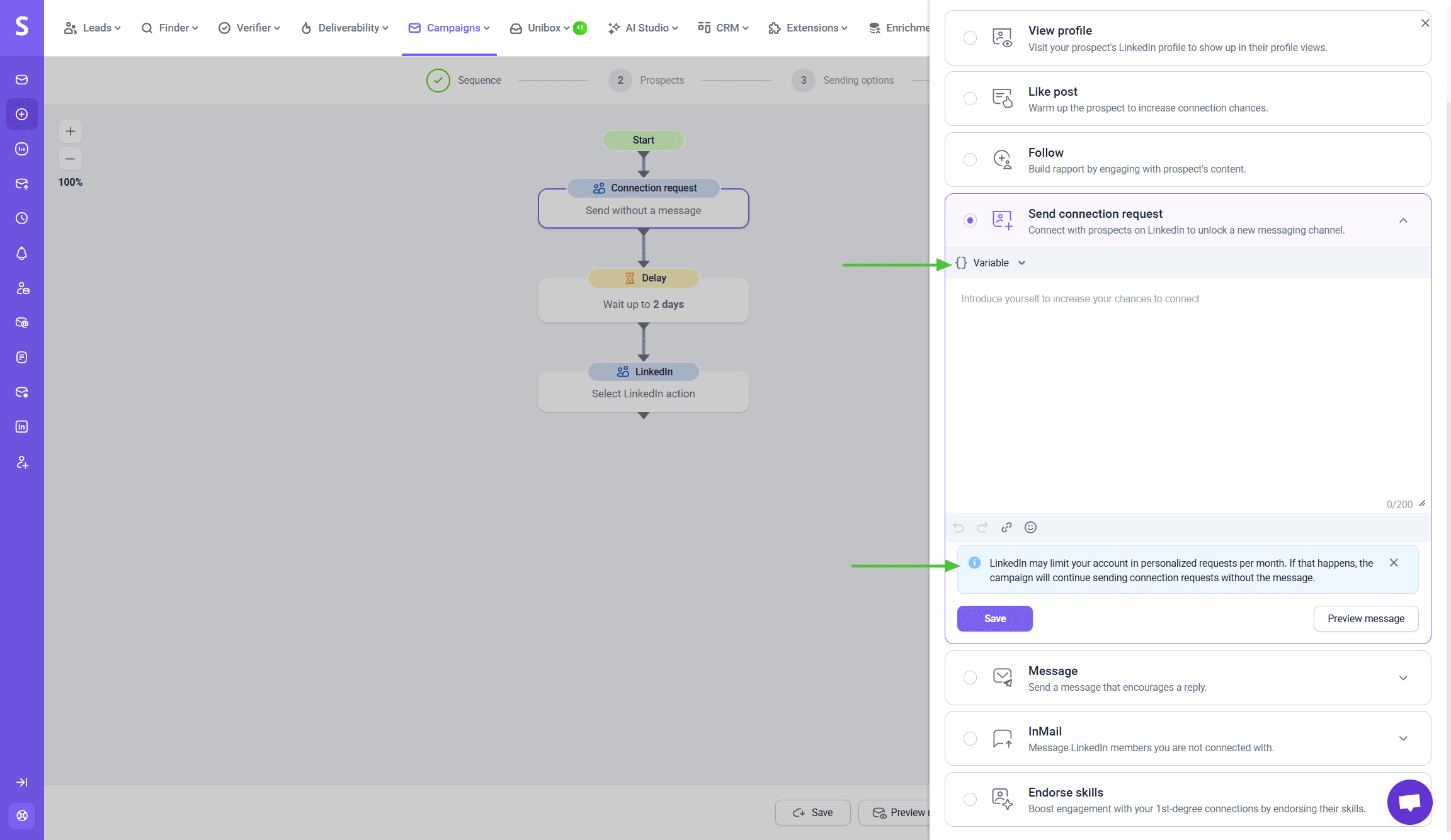 In the sequence editor, add LinkedIn actions to automate tasks like viewing or following profiles, liking posts, sending connection requests, sending messages or InMails, and endorsing skills.