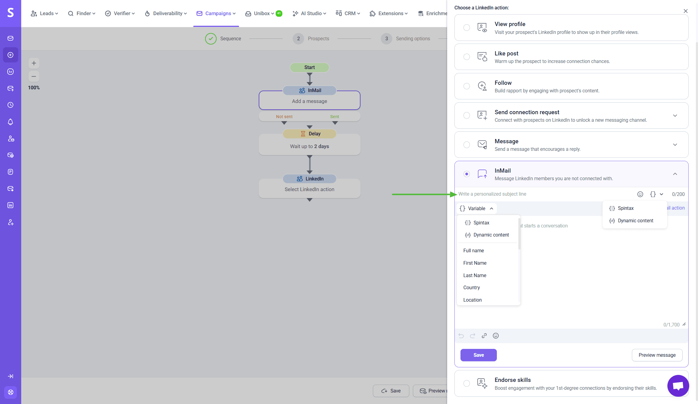 Add a LinkedIn step and select InMail. Personalize it with variables and keep it short.