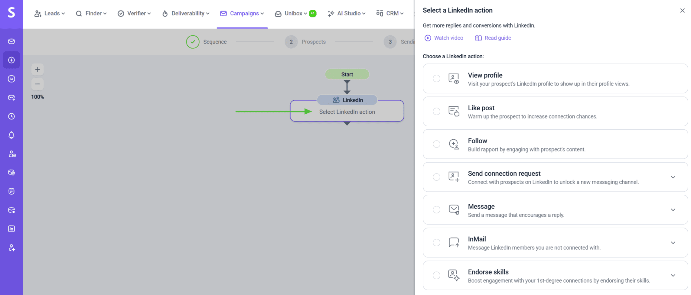 To add a LinkedIn action to your sequence, select the LinkedIn step from the menu on the right, then choose the action you want it to perform.